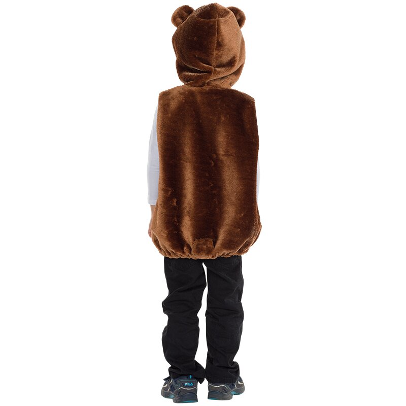 Sleeveless tunic made of brown plush. Ears, eyes, a nose and a mouth are affixed to the attached hood. Paw prints are appliquéd to the front of the tunic, a small tail is attached to the back.