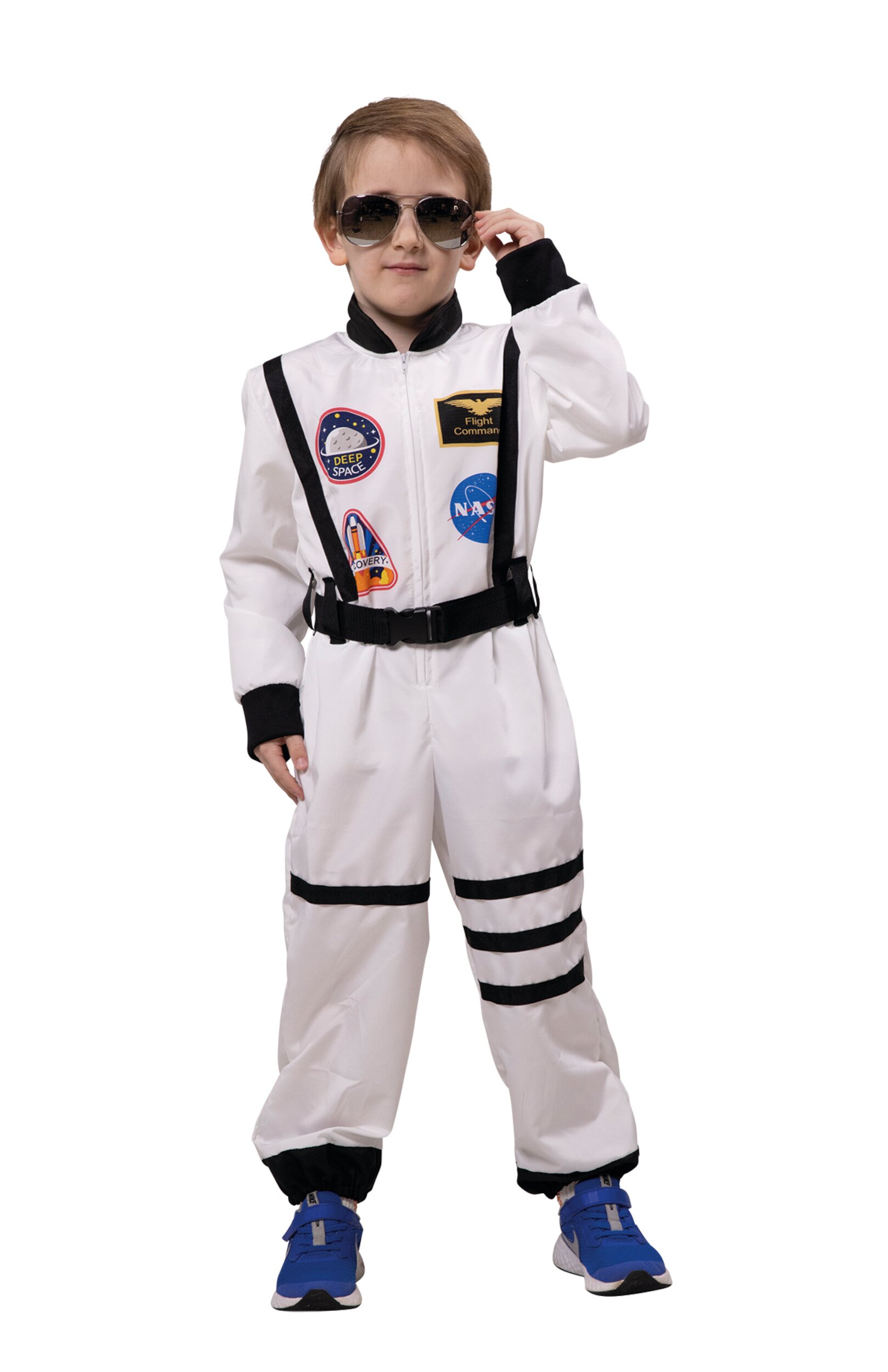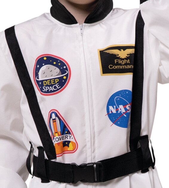 - White jumpsuit with space-themed printed badges (NASA, Deep Space, Discovery, Flight Commander)