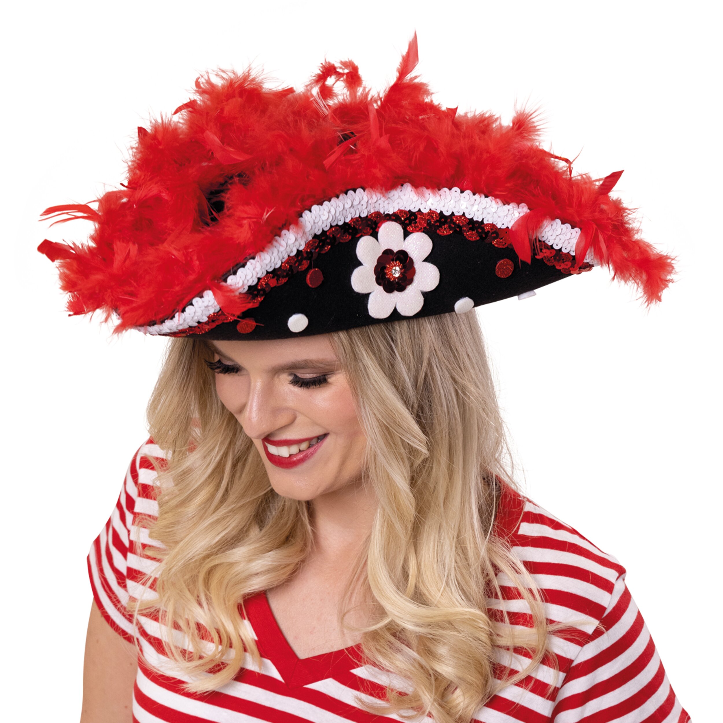 Product details: *Mariechen tricorn / carnival hat *Classic tricorn shape *Color: Black with red and white details *Decorated with red feathers and sequins *Decorative appliqués (dots & flower) *Comfortable fit for extended wear *Ideal for carnival, Fasching, guard & show dance