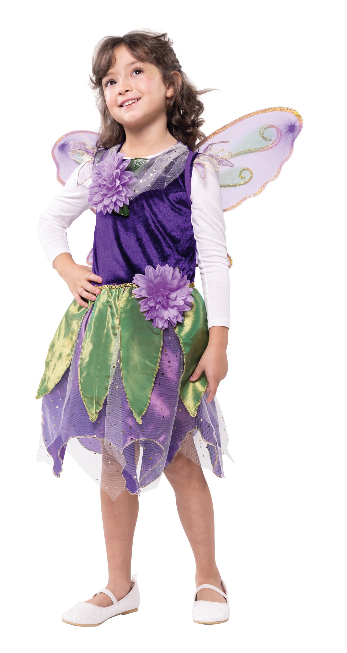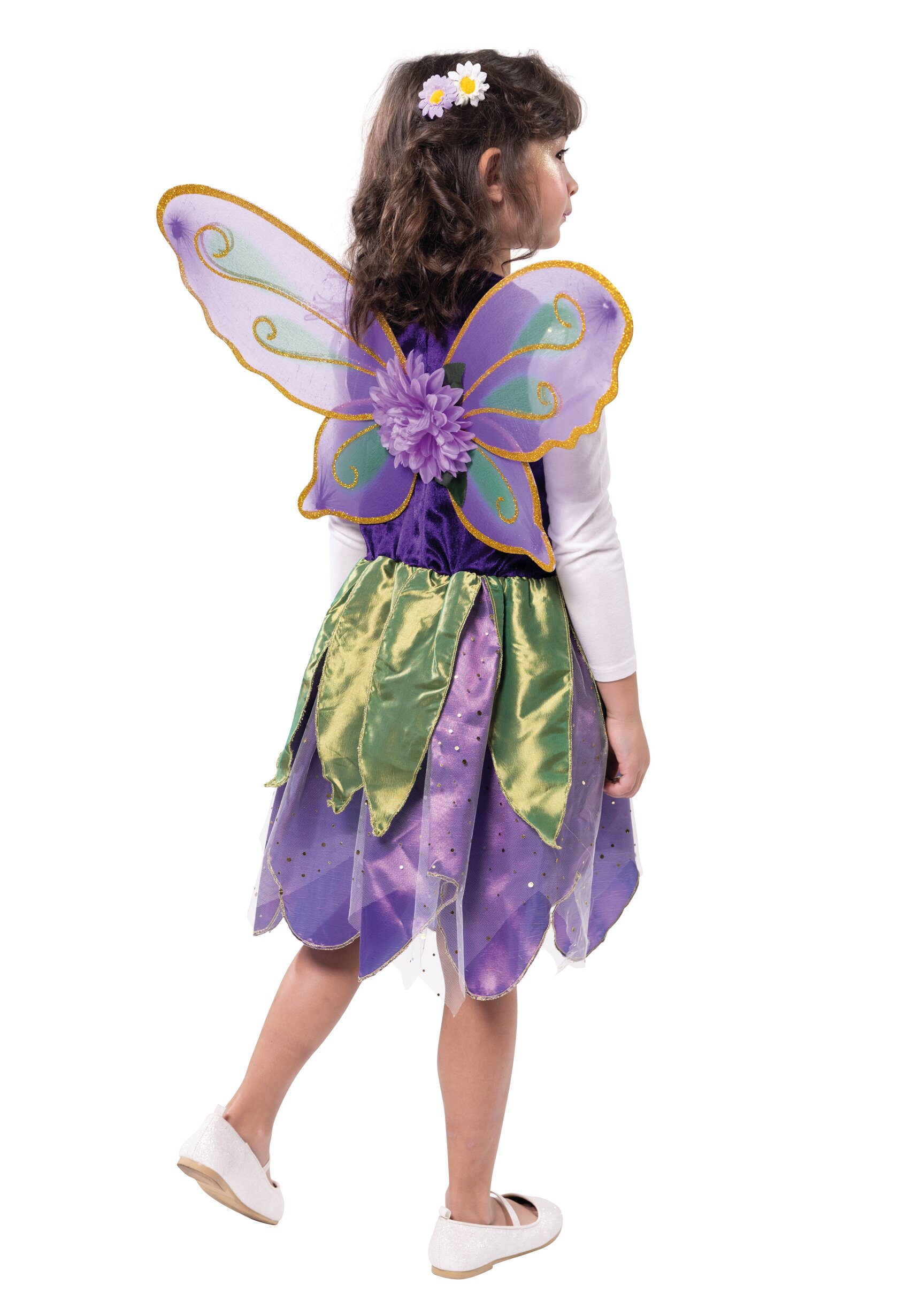 The top is made of panne velvet, the skirt is made of purple satin fabric and is overlaid with a layer of light tulle fabric with golden glitter dots and satin fabric strips cut in a leaf shape. A purple fabric flower and a gold-turquoise decorative border, reminiscent of a delicate belt, are attached to the front waist. The neckline is decorated with glitter tulle and another purple fabric flower, while small transparent “leaves” are attached to the shoulders. The fairy wings are also purple with decoration and a fabric flower is placed in the middle. They are held over the shoulders with elastic bands.