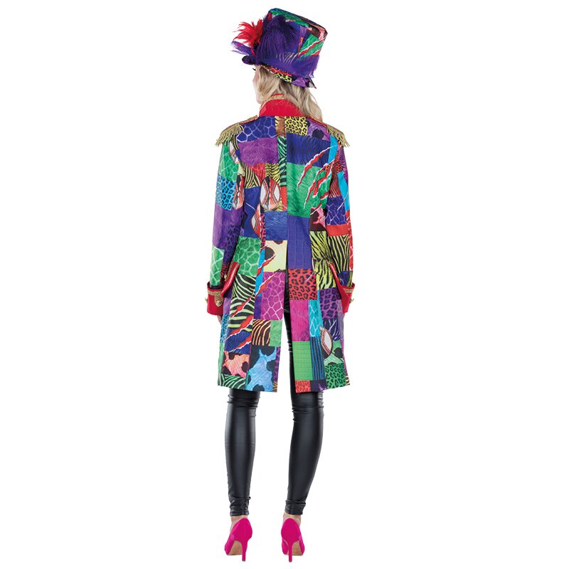 Tailcoat for women, made of patches in varying patterns and colors. The lapels, pocket flaps and cuffs are made from a red fabric, trimmed with gold braids and buttons. The jacket is adorned with epaulets.