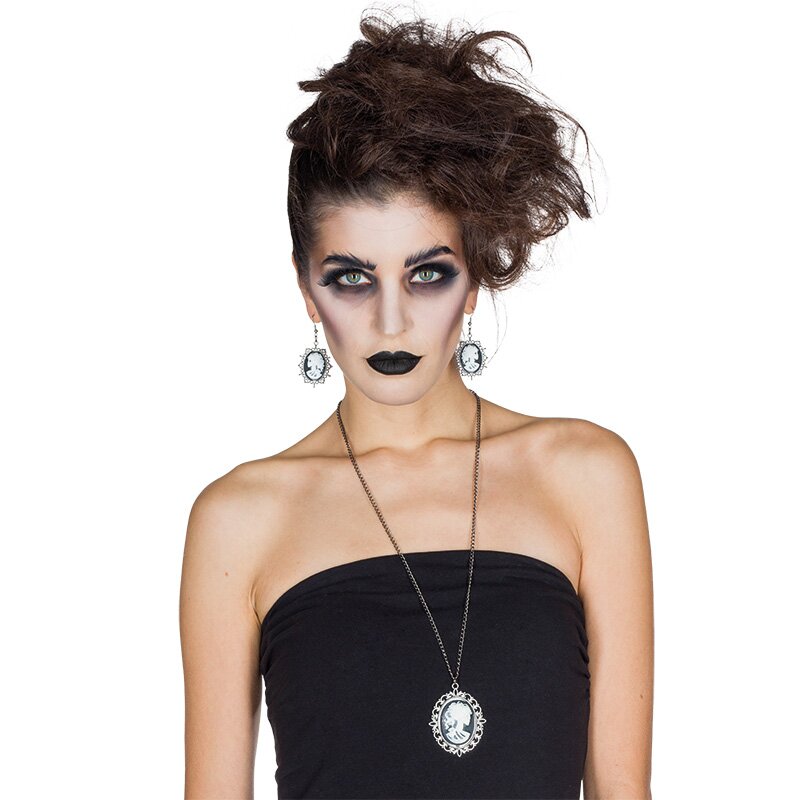 Necklace with a gothic cameo pendant, that shows the relief of a femal skull. The pendant has an intricate silver setting.