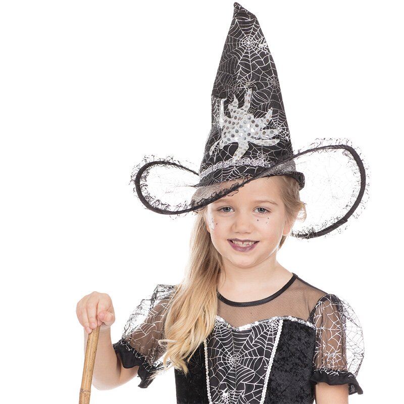 Black witch hat for children. The hat has a silver spider-web print and a transparent brim with a ruffled trim. The hat is adorned with a silver hat-band.