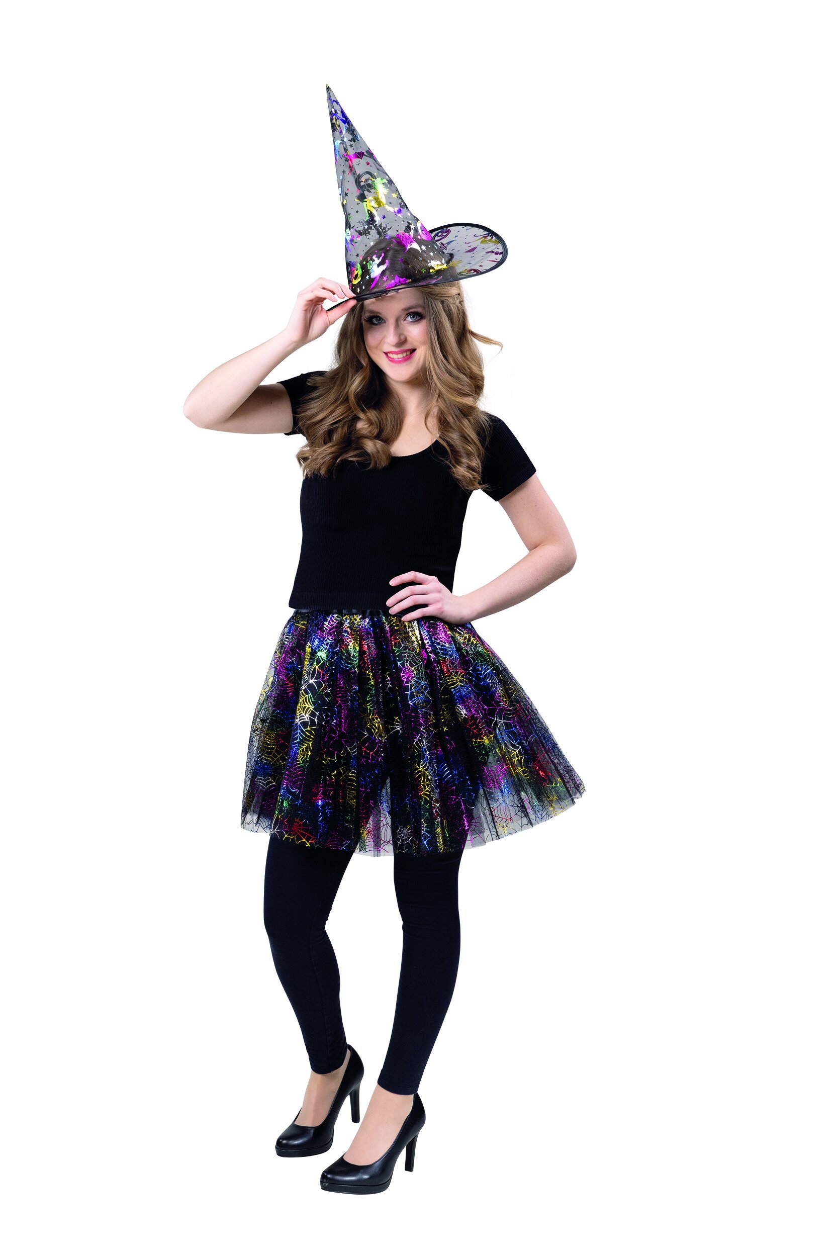 Three-layer black tulle skirt with a metallic spider web print on the top layer. The spider web and the spiders waiting in it shimmer in all the colors of the rainbow. The elasticated waistband is trimmed in black satin fabric.
