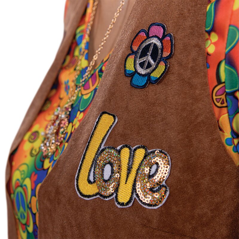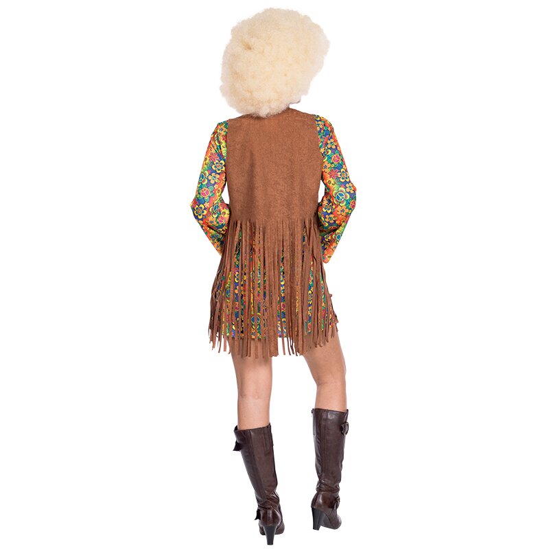 Mini dress with a colorful hippie pattern of flowers and peace signs. Includes a brown leather-look vest with a long fringed border and decorated with various patches.
