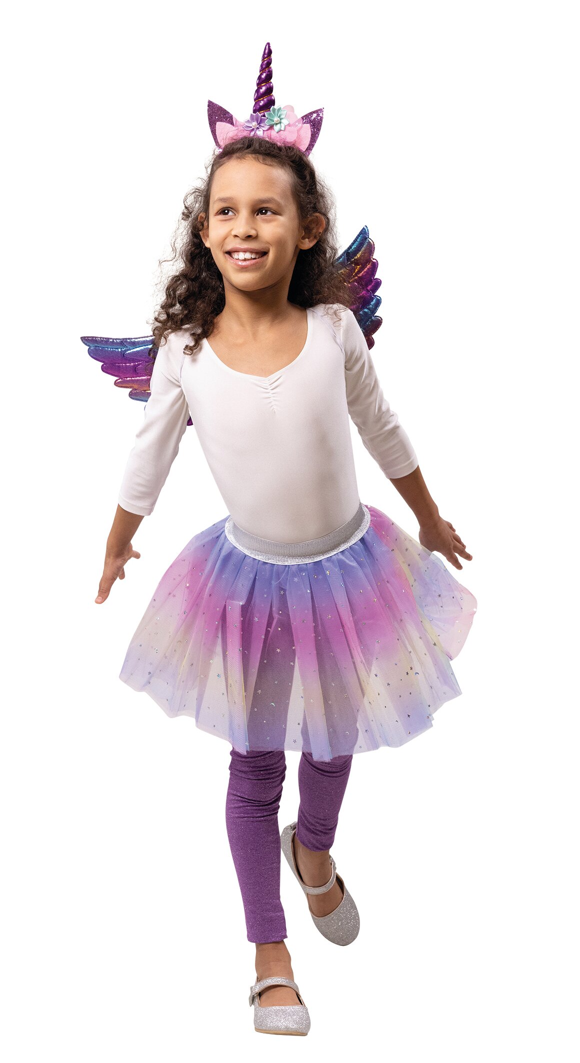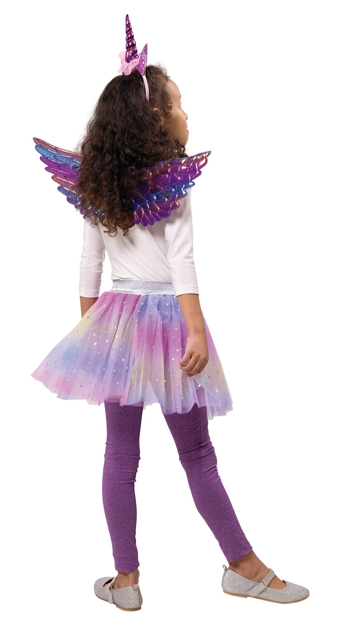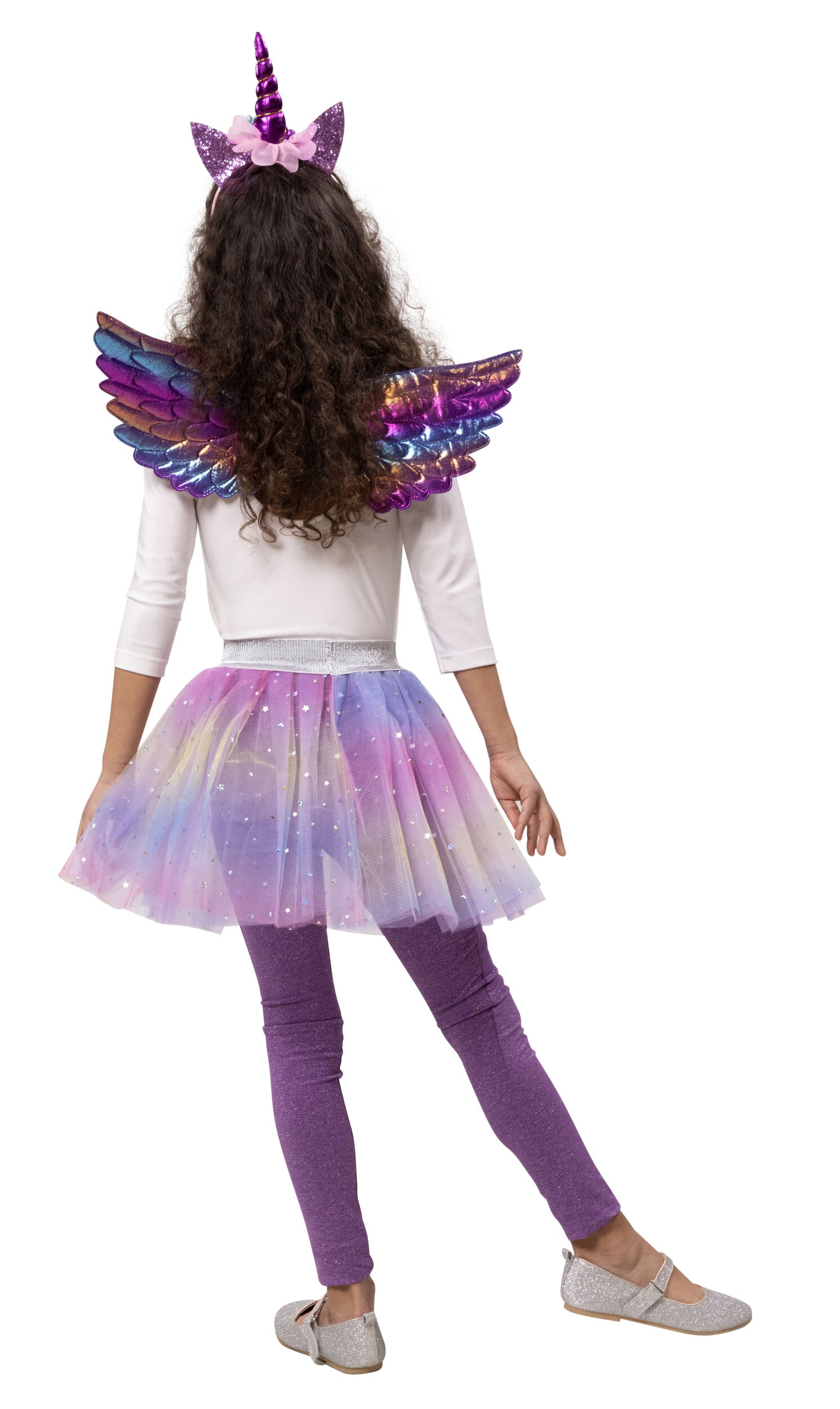 This cute unicorn set consists of a two-layer tulle skirt with a silver elastic waistband, wings and a headband.