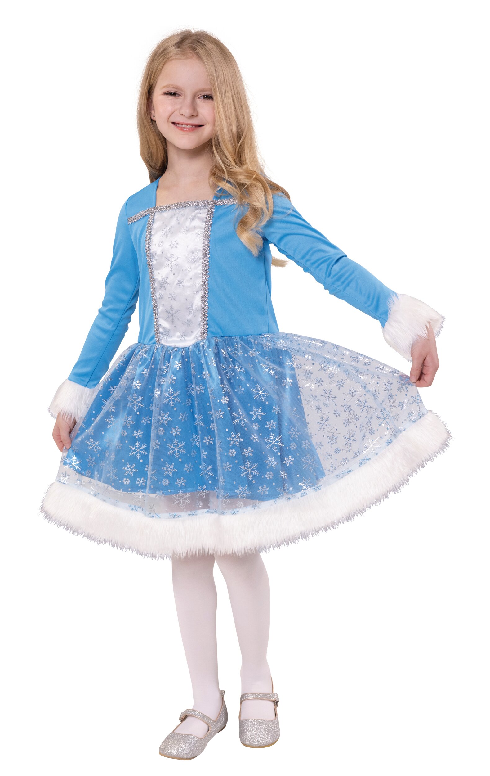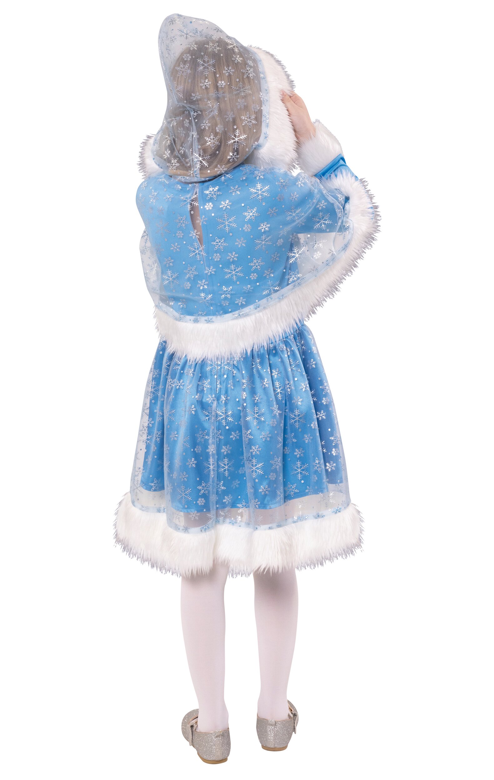 Princess costume consisting of a dress and a short hooded cape. The bright blue dress has a white inlay that is framed by a silver trim. The hems of the sleeves and the overskirt are trimmed with a white faux fur. The hooded cape is made of the same glittering tulle that is also used for the overskirt and is lined with white faux fur.