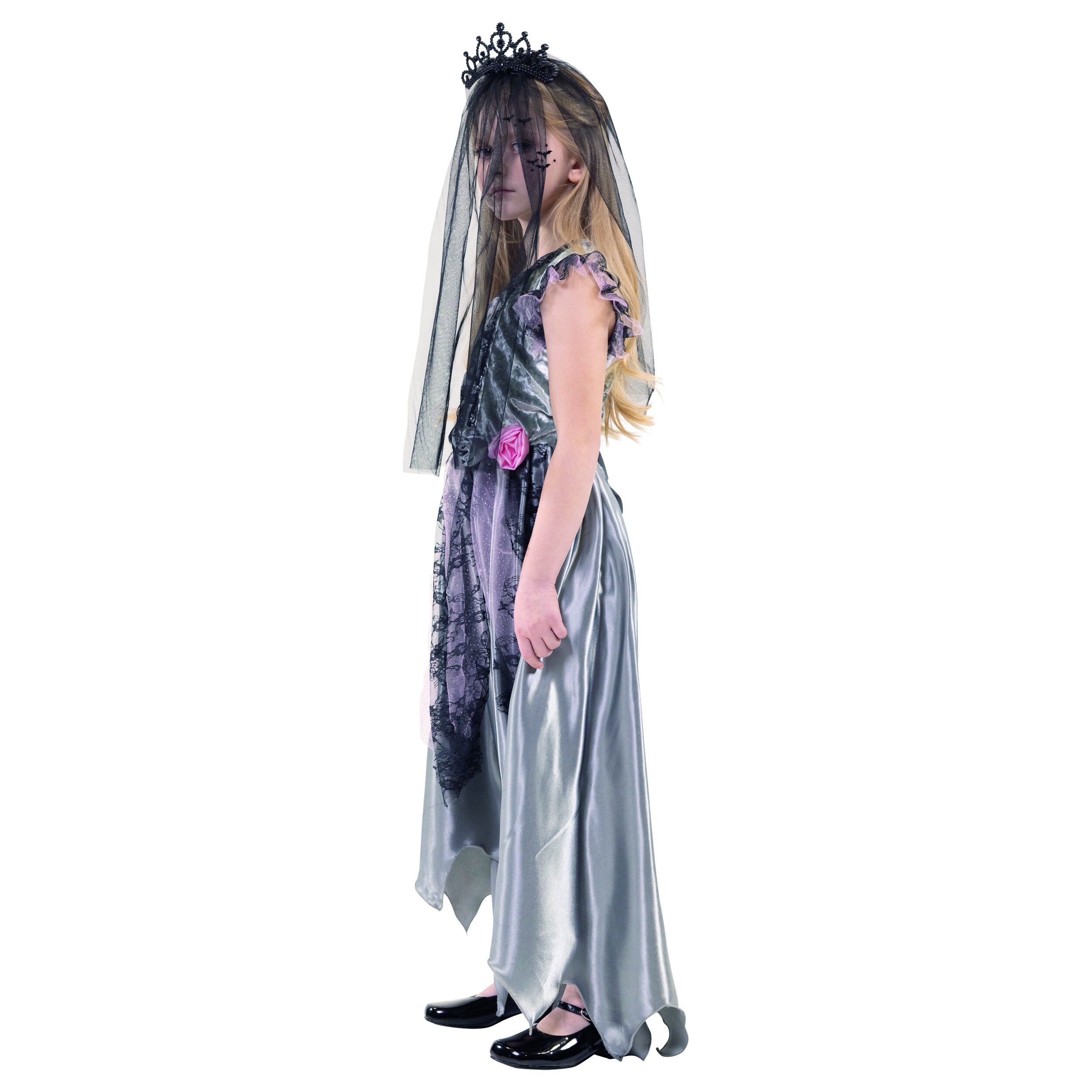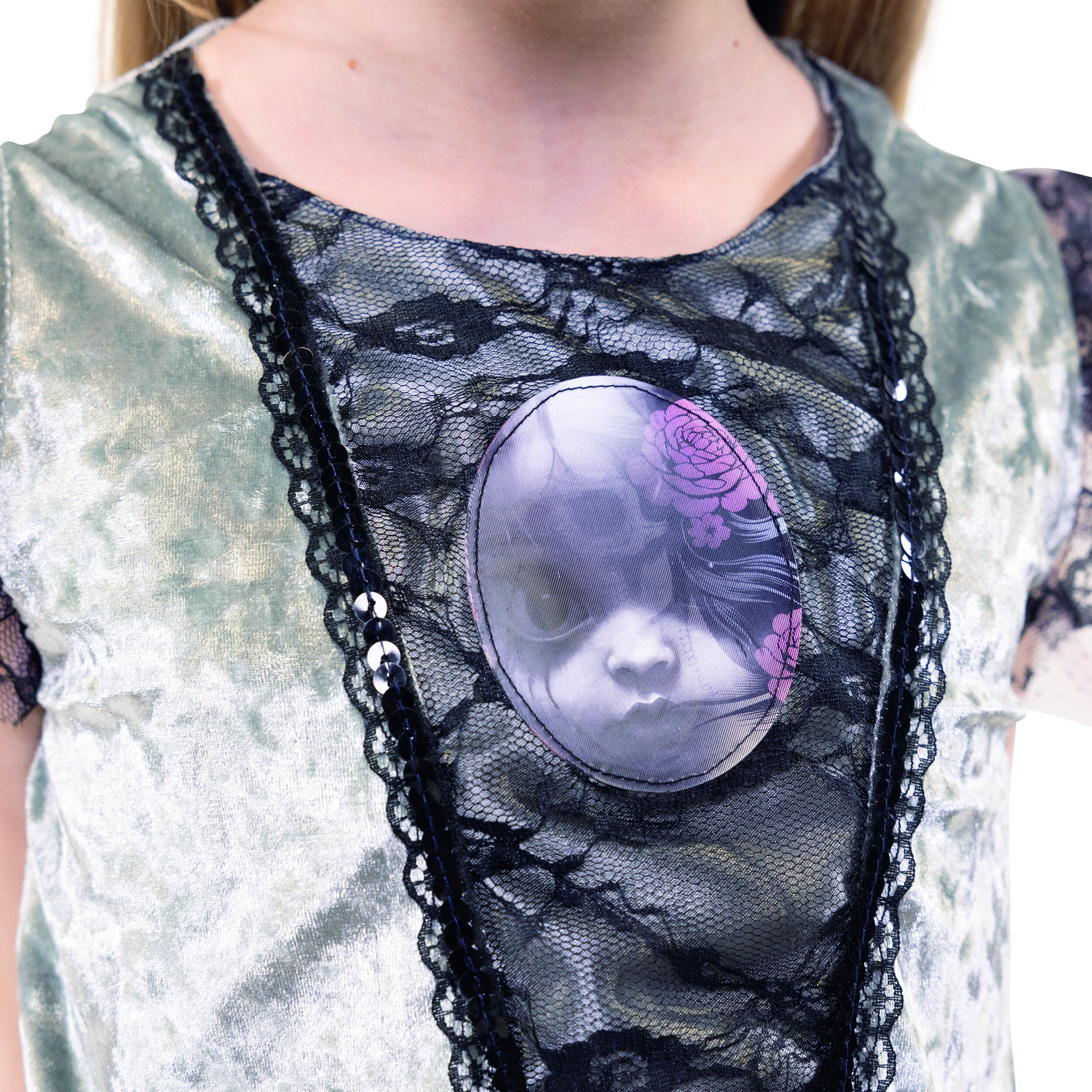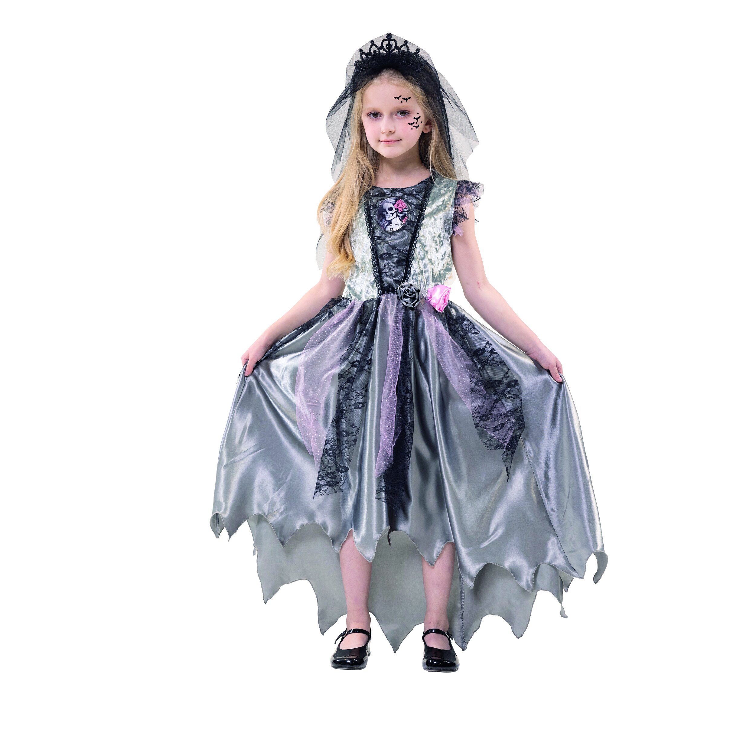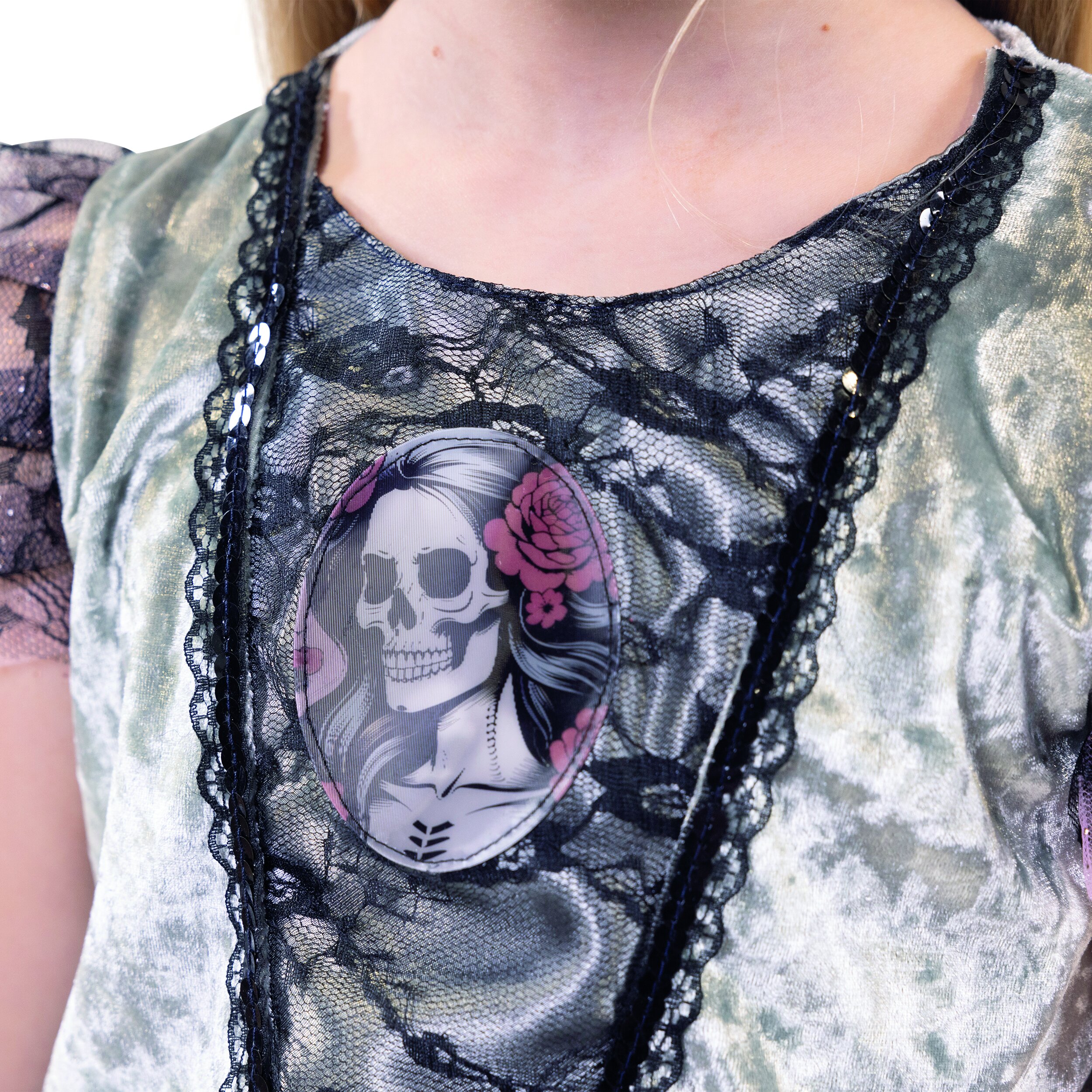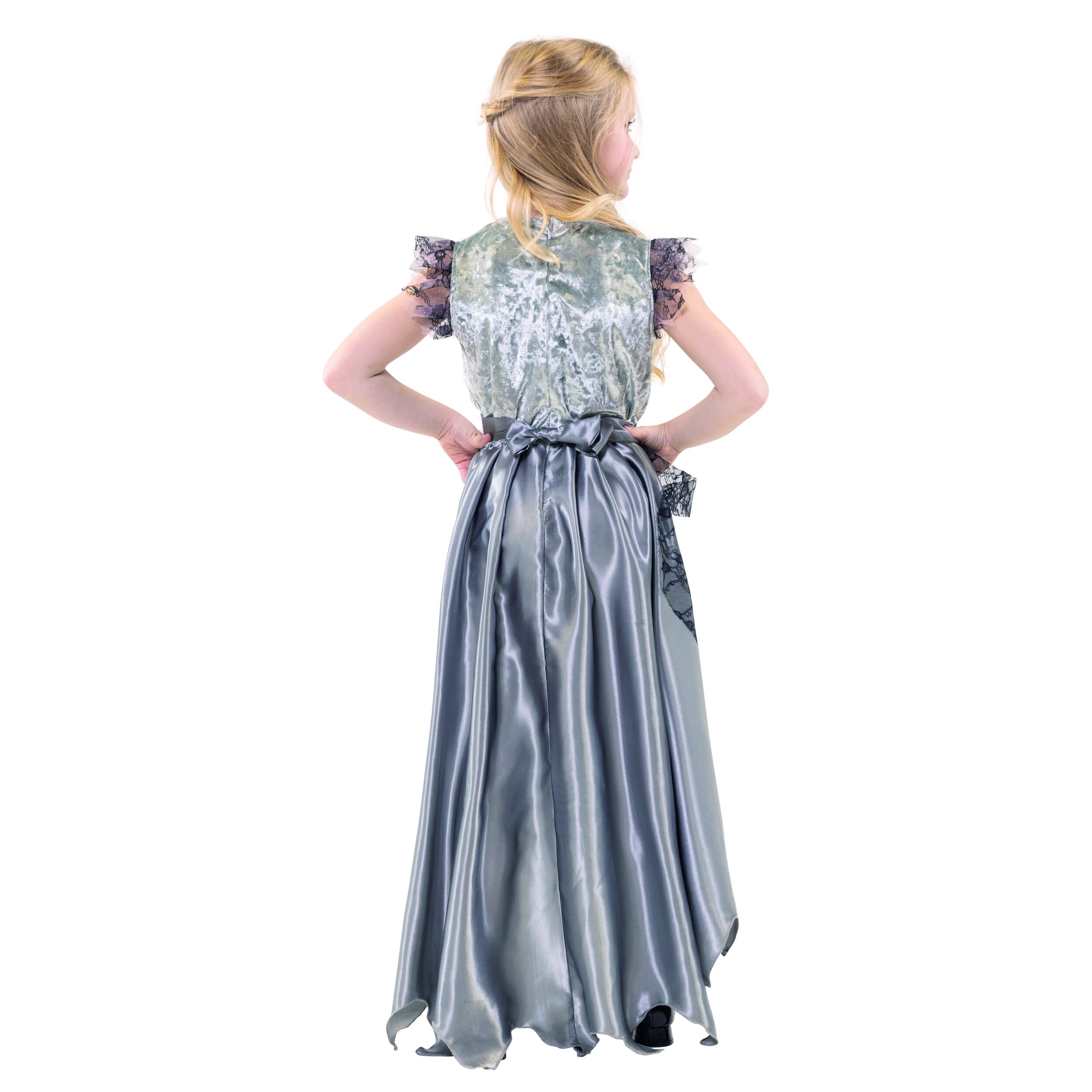 Detailed, elegant Halloween dress with gray panne velvet and a flowing satin skirt that is shorter at the front than at the back and ends in a jagged shape. Transparent strips of fabric are attached to the front waist, one pink with glitter and one with black lace. Decorations in the shoulder area and a black lace insert on the upper body are made from the same fabric. There is a hologram image in the middle which, depending on the angle of view, shows the face of a child or a skull with roses in its hair. Two fabric flowers in pink and gray are attached to the waist on the left and the dress has a decorative gray satin bow at the back.