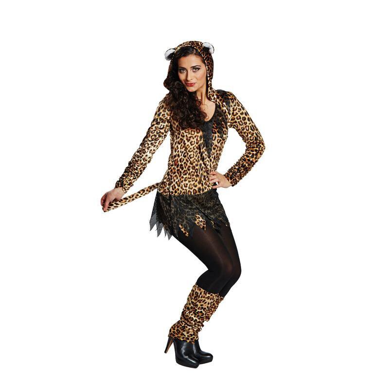 Long hooded shirt in a leopard print with a jagged hem. The hood is adorned with plush ears. Black tulle fabric with a jagged hem is attached to the waist and the neckline. Includes matching legwarmers.