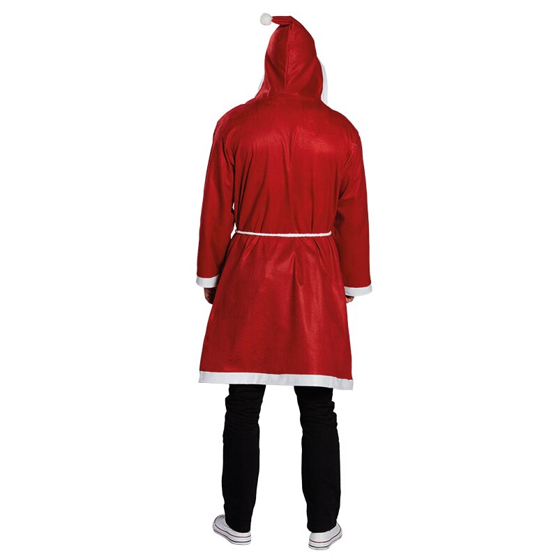 Long red hooded coat with white trim, a white rope belt and Santa Claus beard.