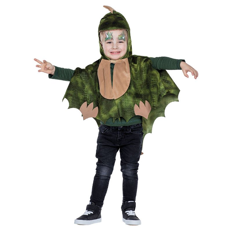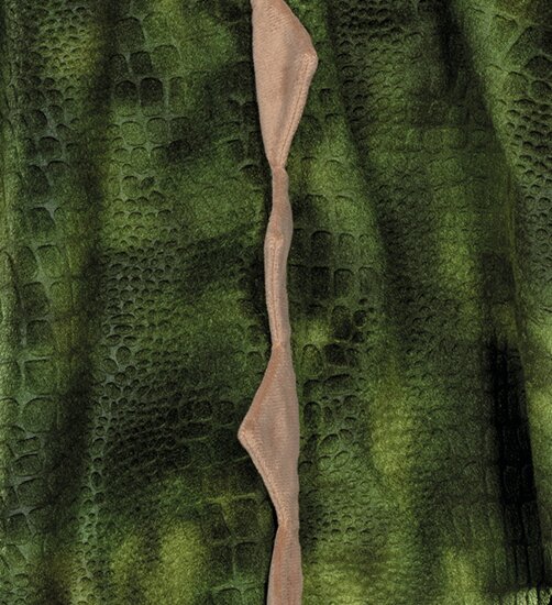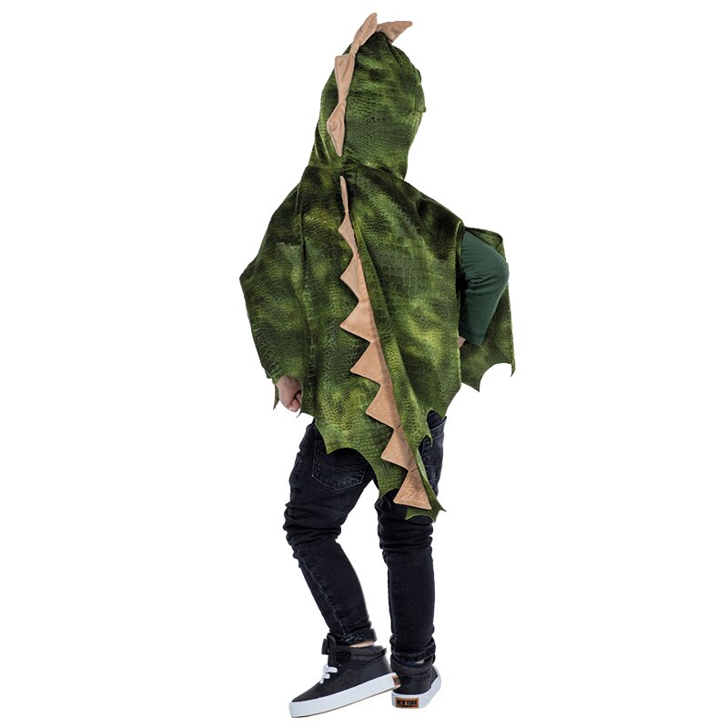 Hooded cape with a green scaled pattern and sculpted fabric plates running down the back. The hood is adorned with eyes and nostrils.