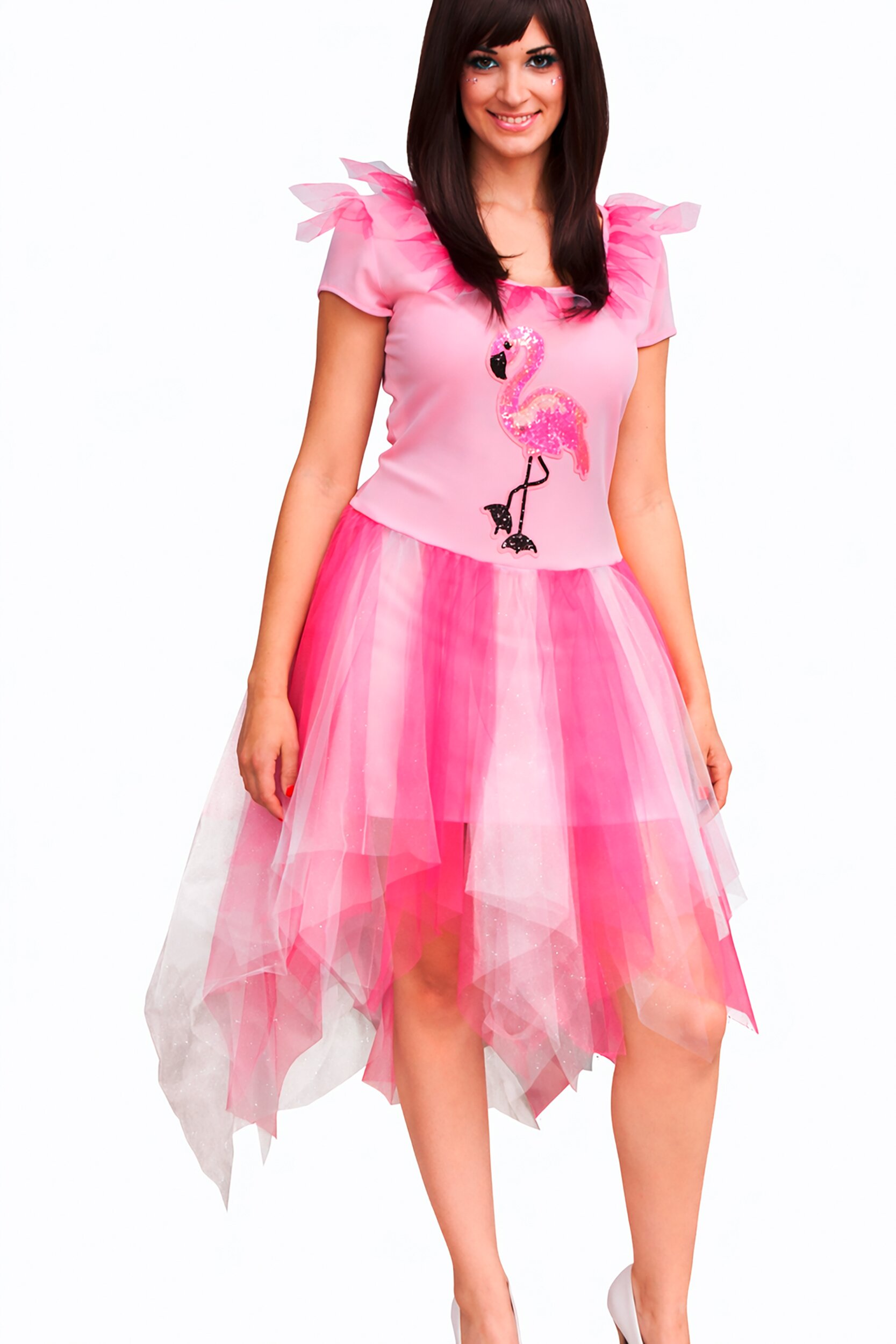 Das Kleid kombiniert ein Oberteil mit glänzender Flamingo-Applikation und dekorativen Details mit einem mehrlagigen Rock aus Tüll in verschiedenen Rosatönen. Dadurch entsteht ein lebendiger Look, der sofort ins Auge fällt.