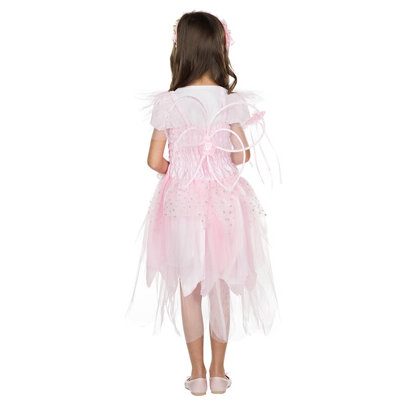Sleeveless strap dress in a soft pastel pink. The front of the gathered top is made of velvet that is decorated with a sequin trim. The straps have attached sheer winglets. The satin skirt is caressed by a tulle overskirt. Pieces of silver star printed tulle are affixed onto the waist. Detachable fairy wings adorned with fabric flowers can be fixed to the back.