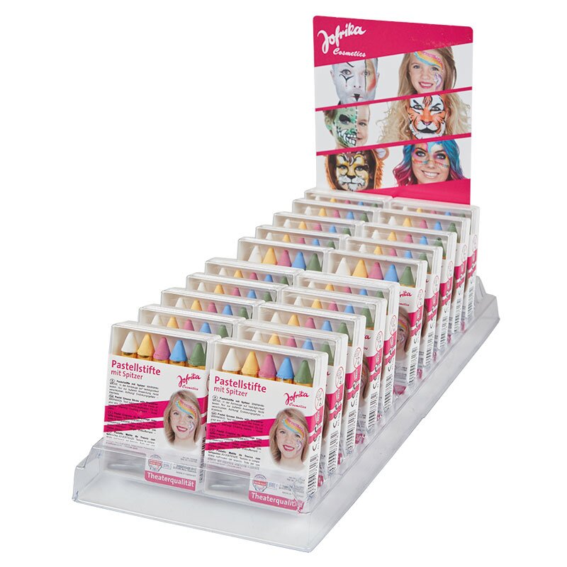 Display of 20 with five make-up pencils in pastel colors (yellow, pink, blue, green) and white; sharpener included. The colors can be washed off with soap and water.