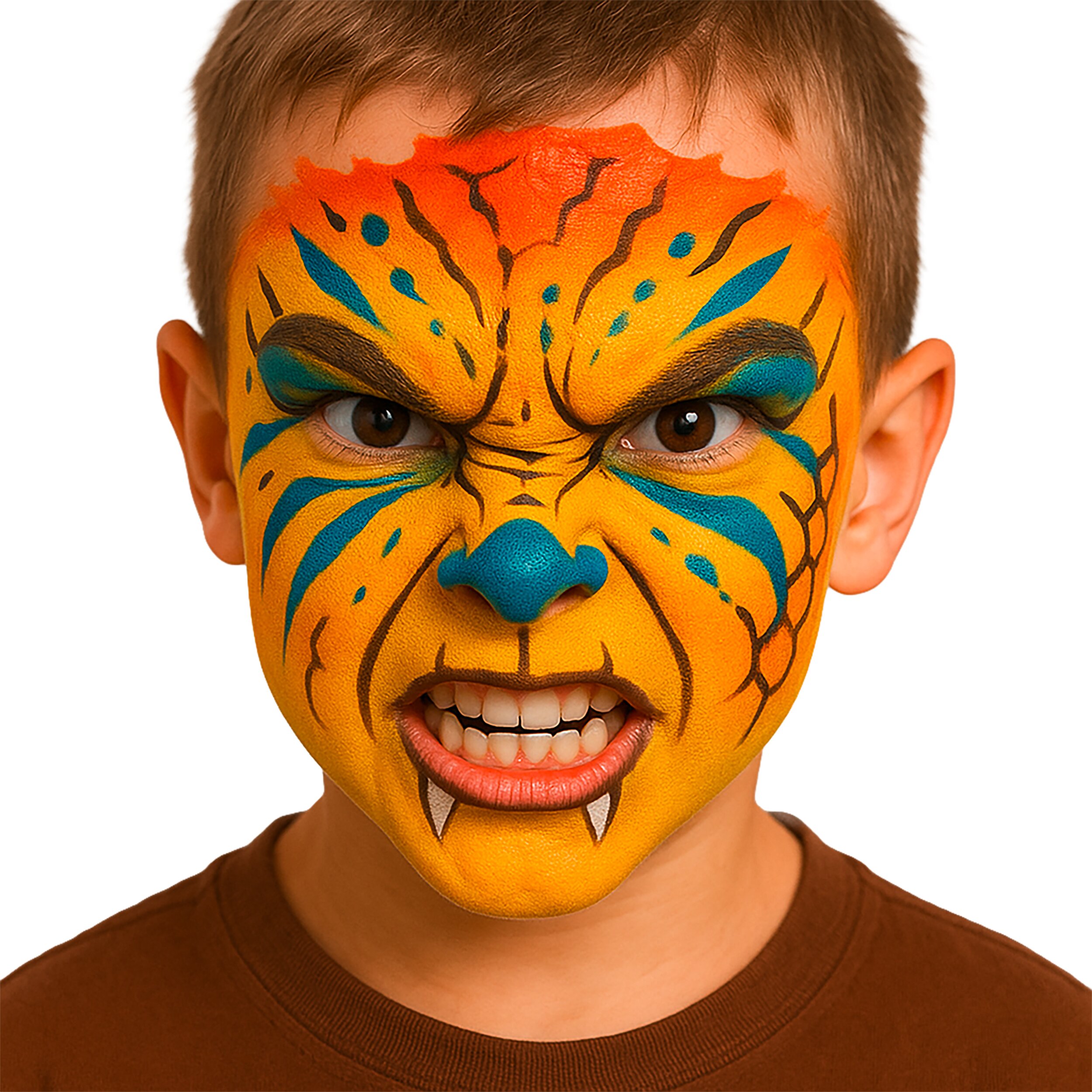 The set contains four coordinated colors (blue, orange, dark-brown, and yellow) that can be used to paint detailed dinosaur faces. Whether it's a T-Rex, a prehistoric monster, or an imaginative jungle dinosaur – there are no limits to creativity.
