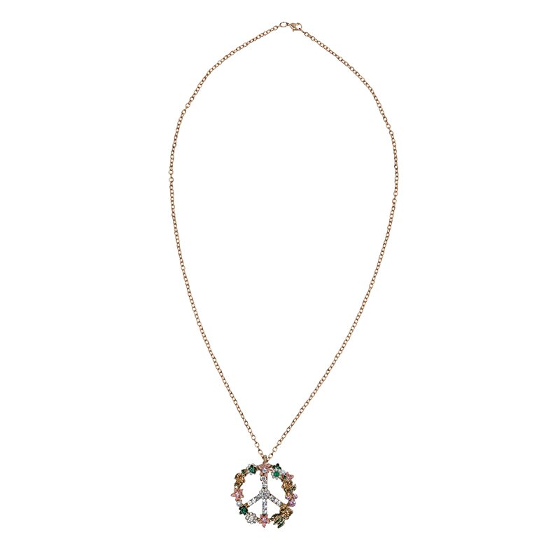 Necklace with a peace symbol that is adorned with rhinestones and little blossoms made of colorful gemstones.