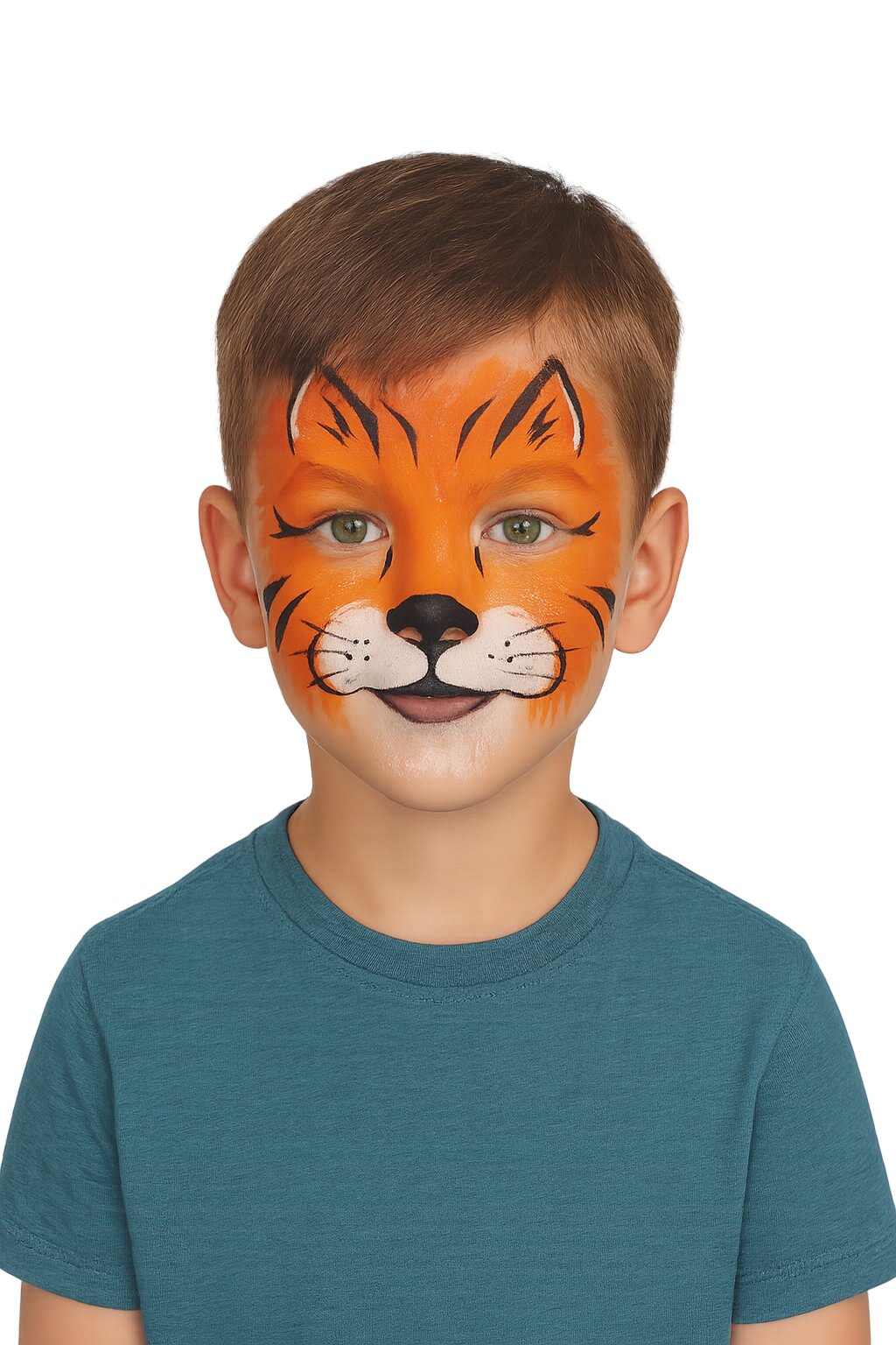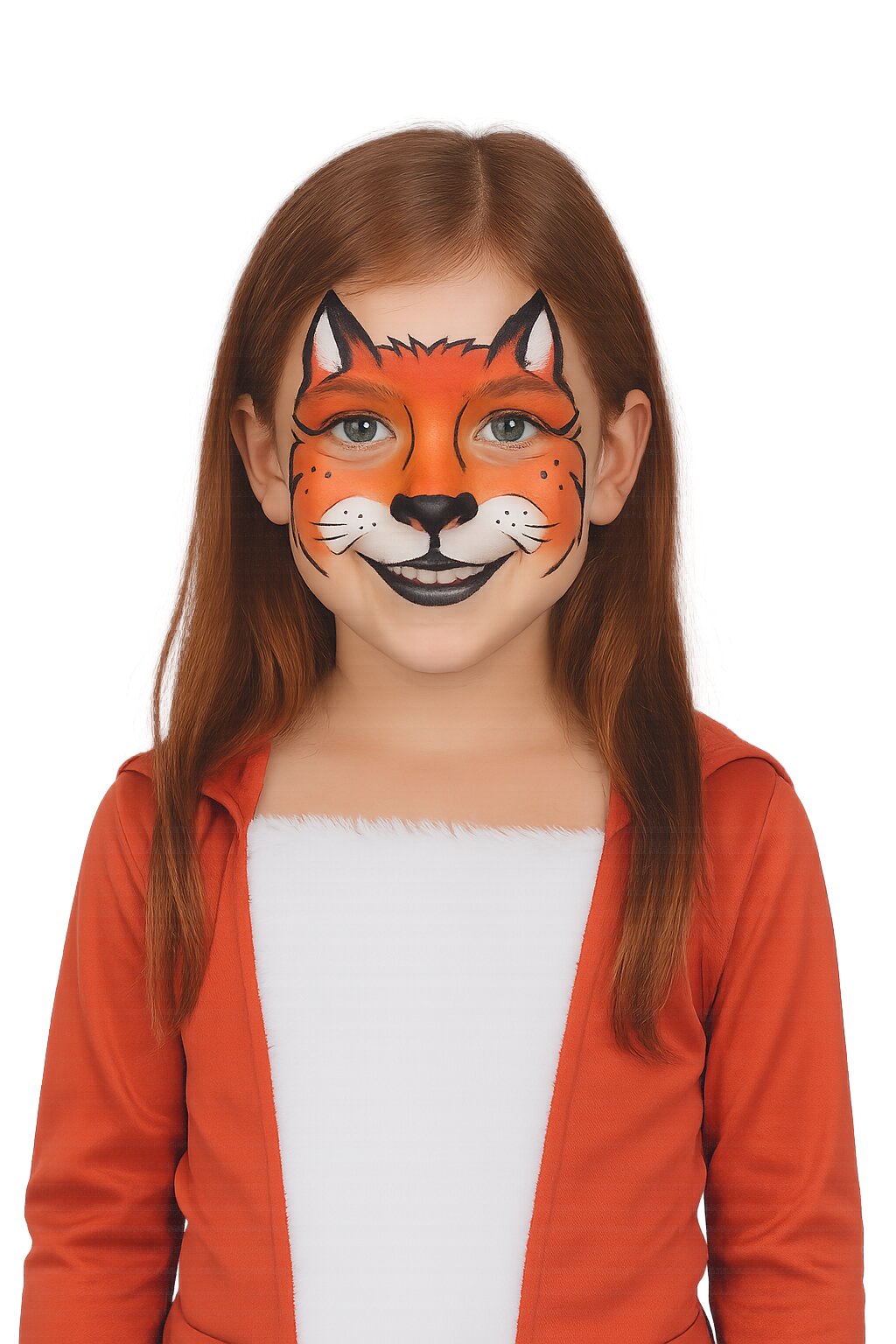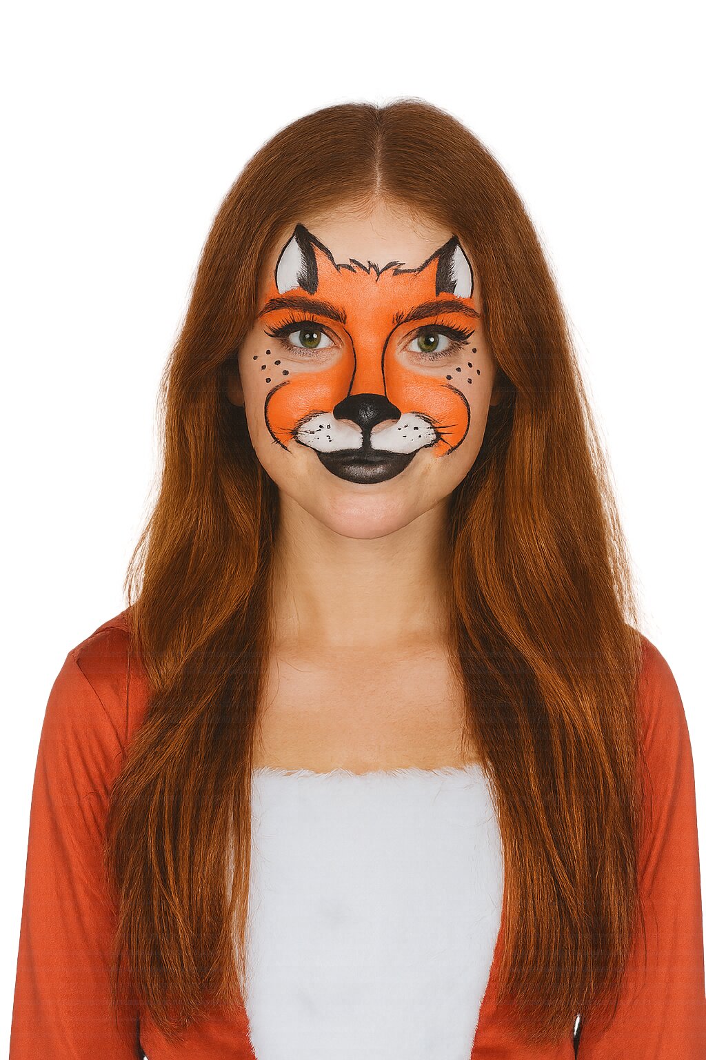 The Aqua-makeup-set contains three colors (white, black, orange) for a fox style, as well as a glitter powder. The makeup has to be mixed with water and is applied with the included applicator. After it has dried it will be smudge-proofed and it is non-greasy. Easy to remove with water and soap.