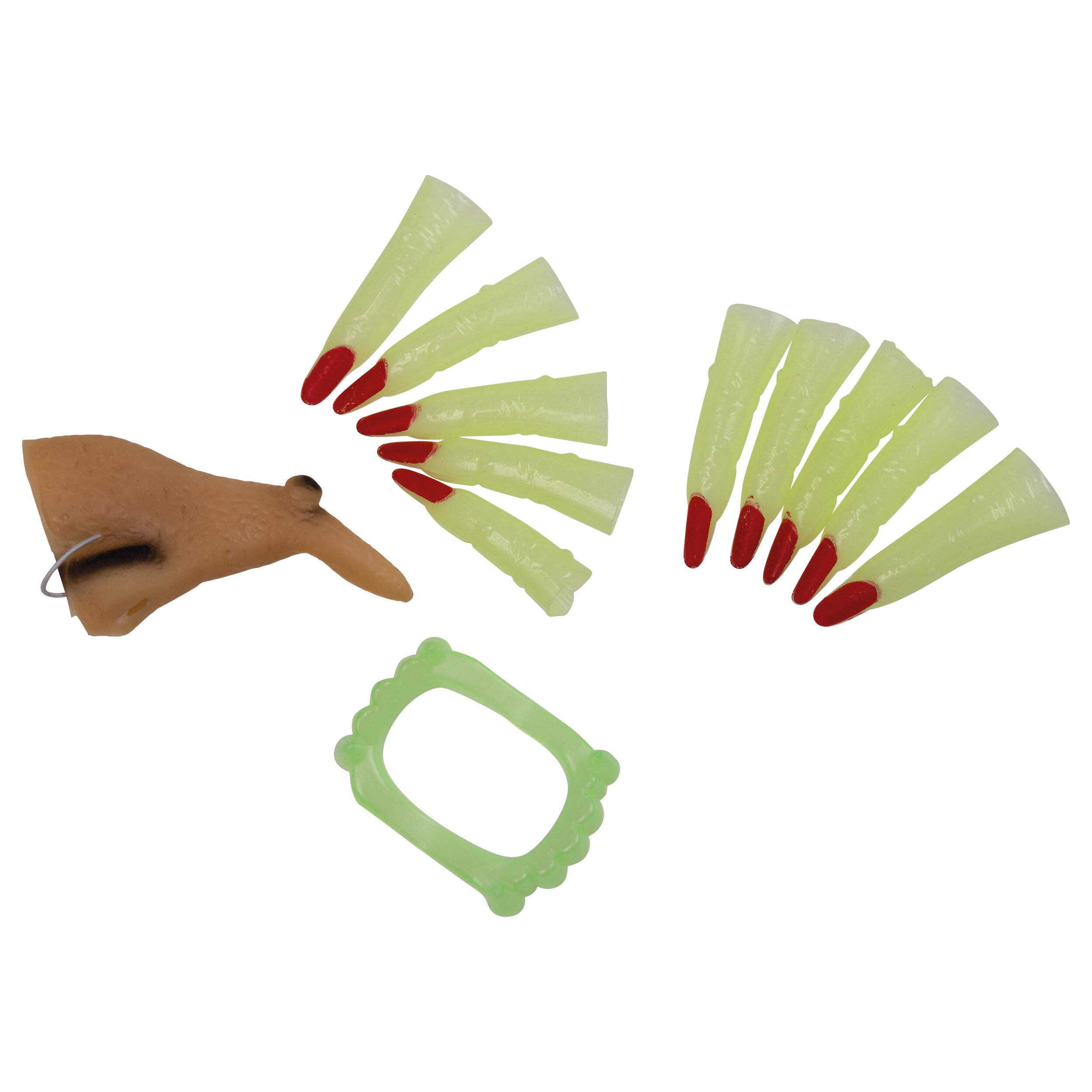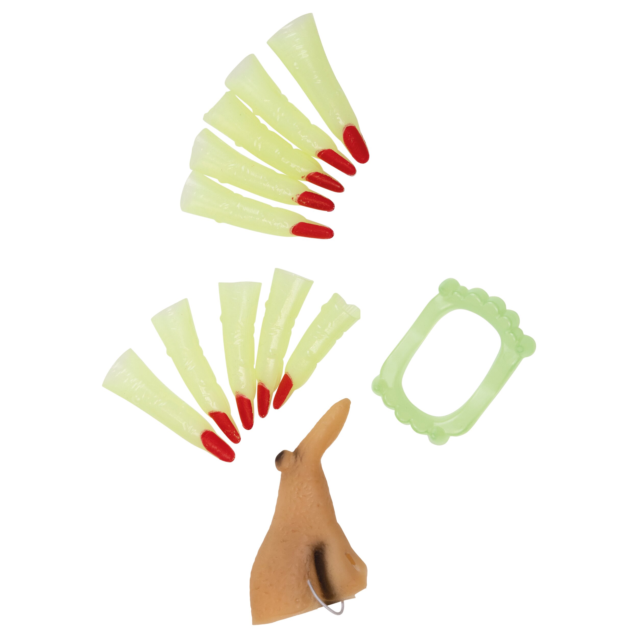 The witch set includes a crooked witch nose with a wart, crooked teeth and finger extensions with affixed red nails. Teeth and fingers are made of plastic that glows in the dark.