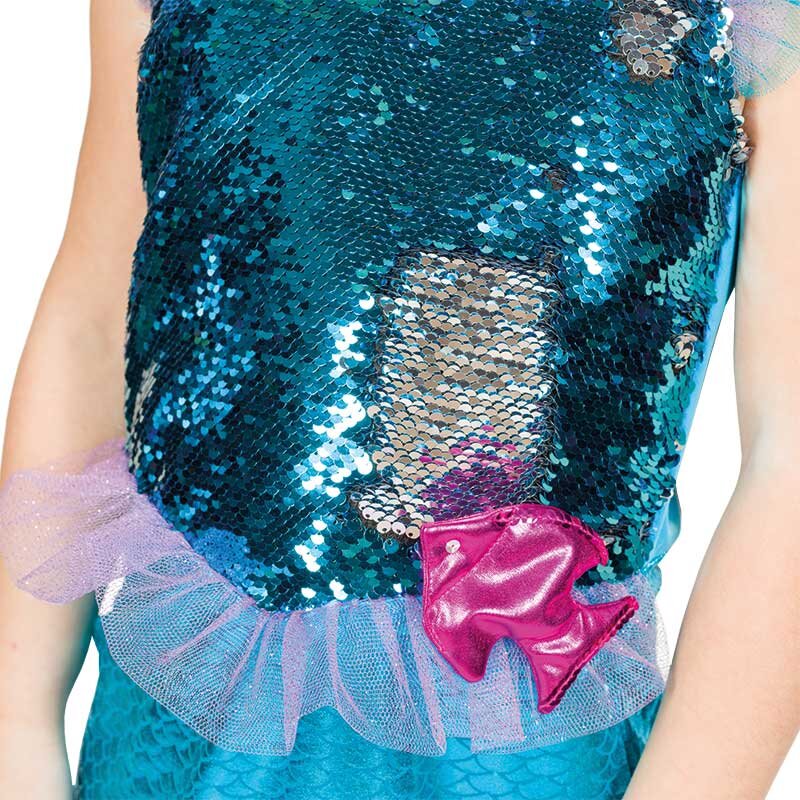Sleeveless mermaid costume with a blue sequined top. By runing one's hand over the sequins, the color changes from blue to silver. The skirt with a blue fish scale pattern has an attached pink flounce that tapers to the back. Tulle ruffles on the shoulders, waist and skirt decorate the costume. A decorative pink fish is attached to the waist.