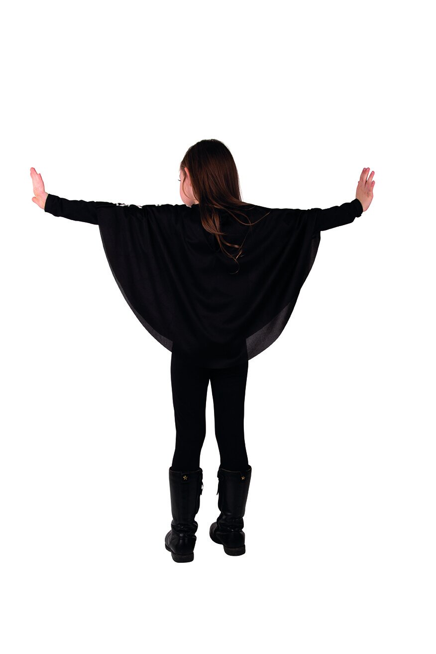 Black poncho with glittering silver printed spider web on the front. There is a plastic spider (brooch) in the spider web, the back is plain black and has a Velcro dot at the neckline.