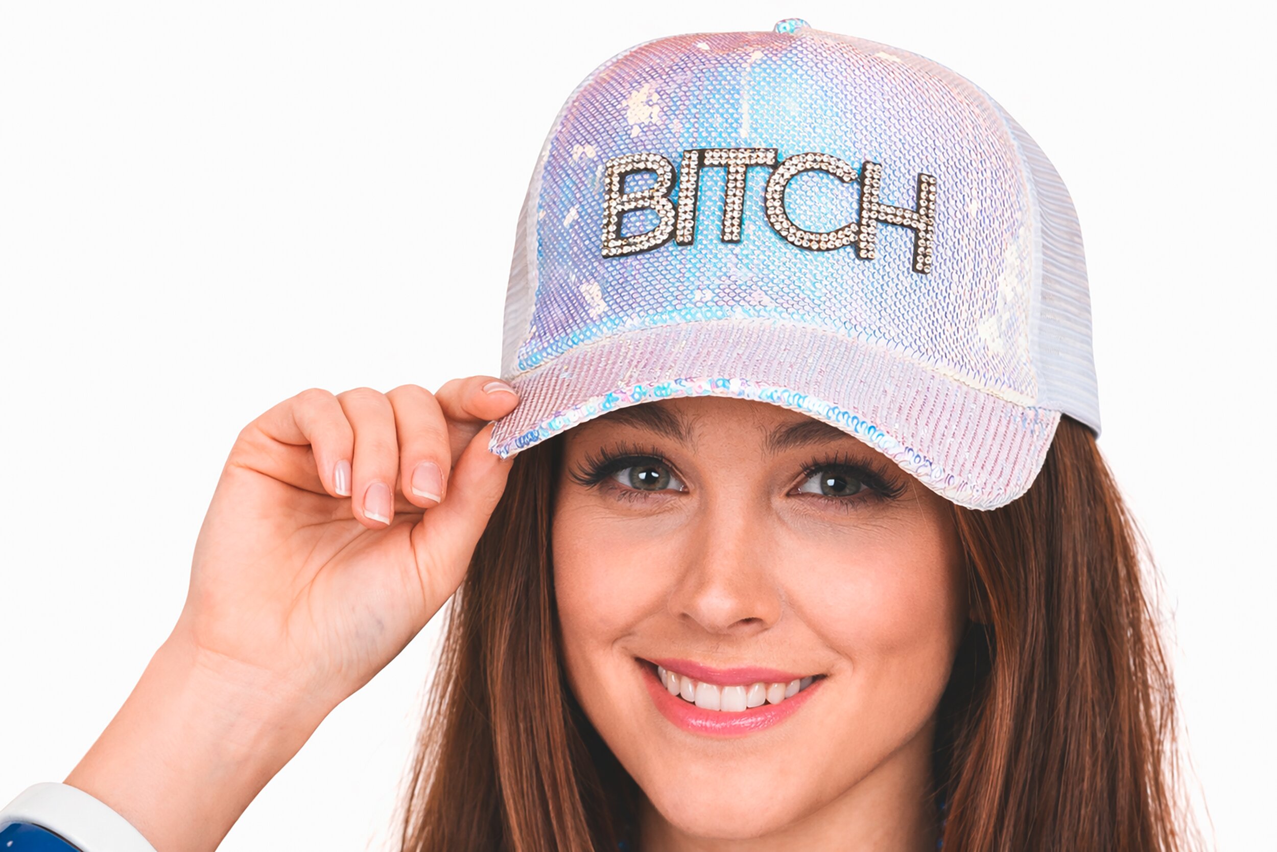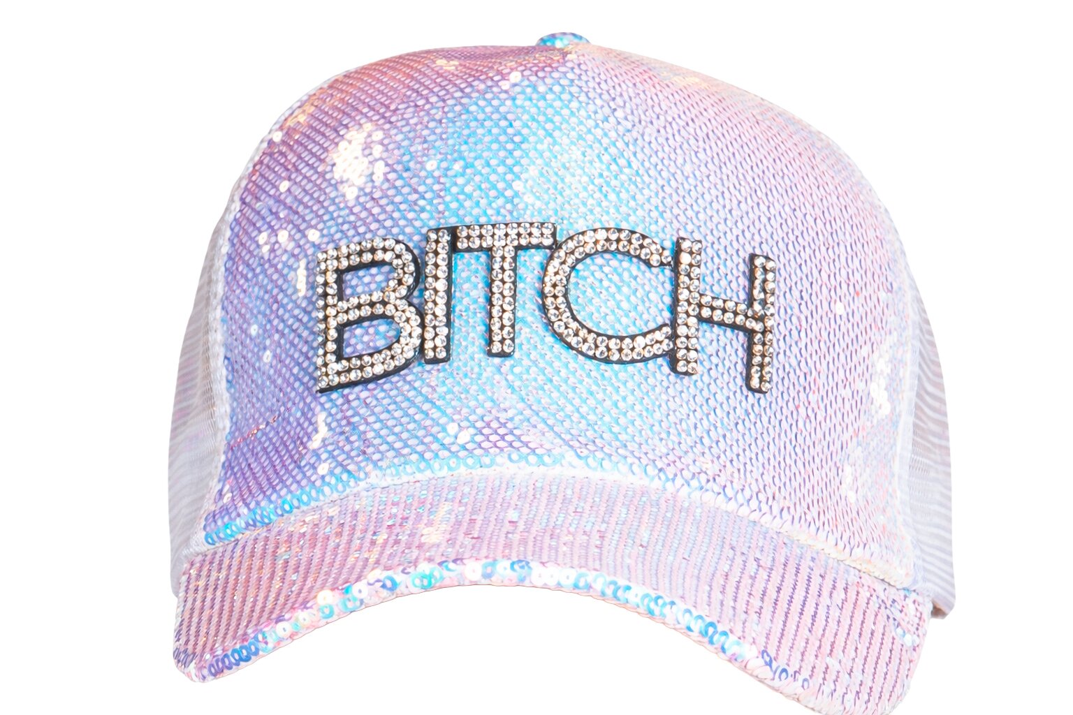 Sequin “Bitch” Cap – an eye-catching statement accessory for parties and festivals.