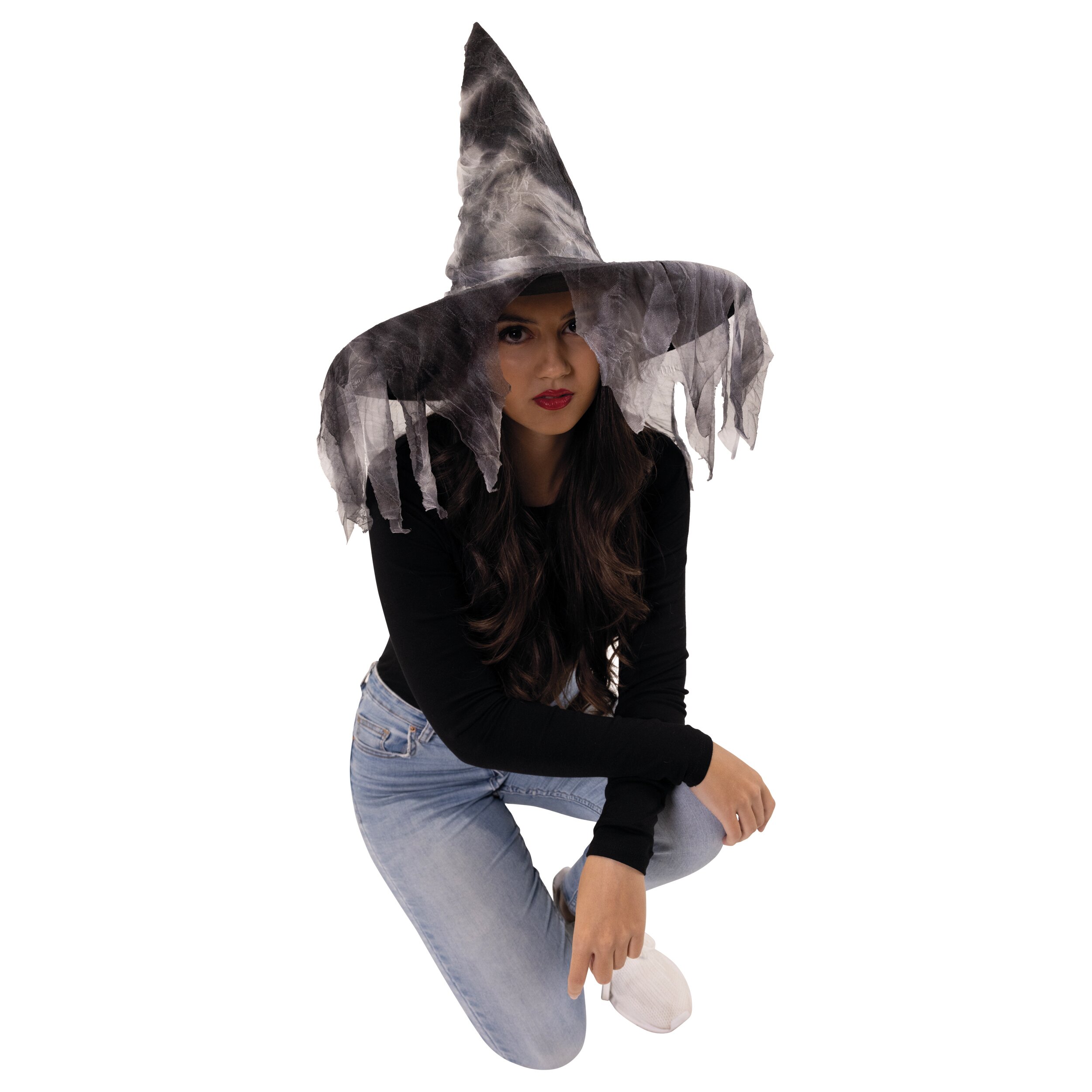 This tattered-look witch’s hat is a striking Halloween accessory with a particularly authentic spooky effect. With its torn appearance and smoky, dark colour scheme, the hat looks as though it has come from an enchanted world and is ideal for witch, horror and fantasy costumes.