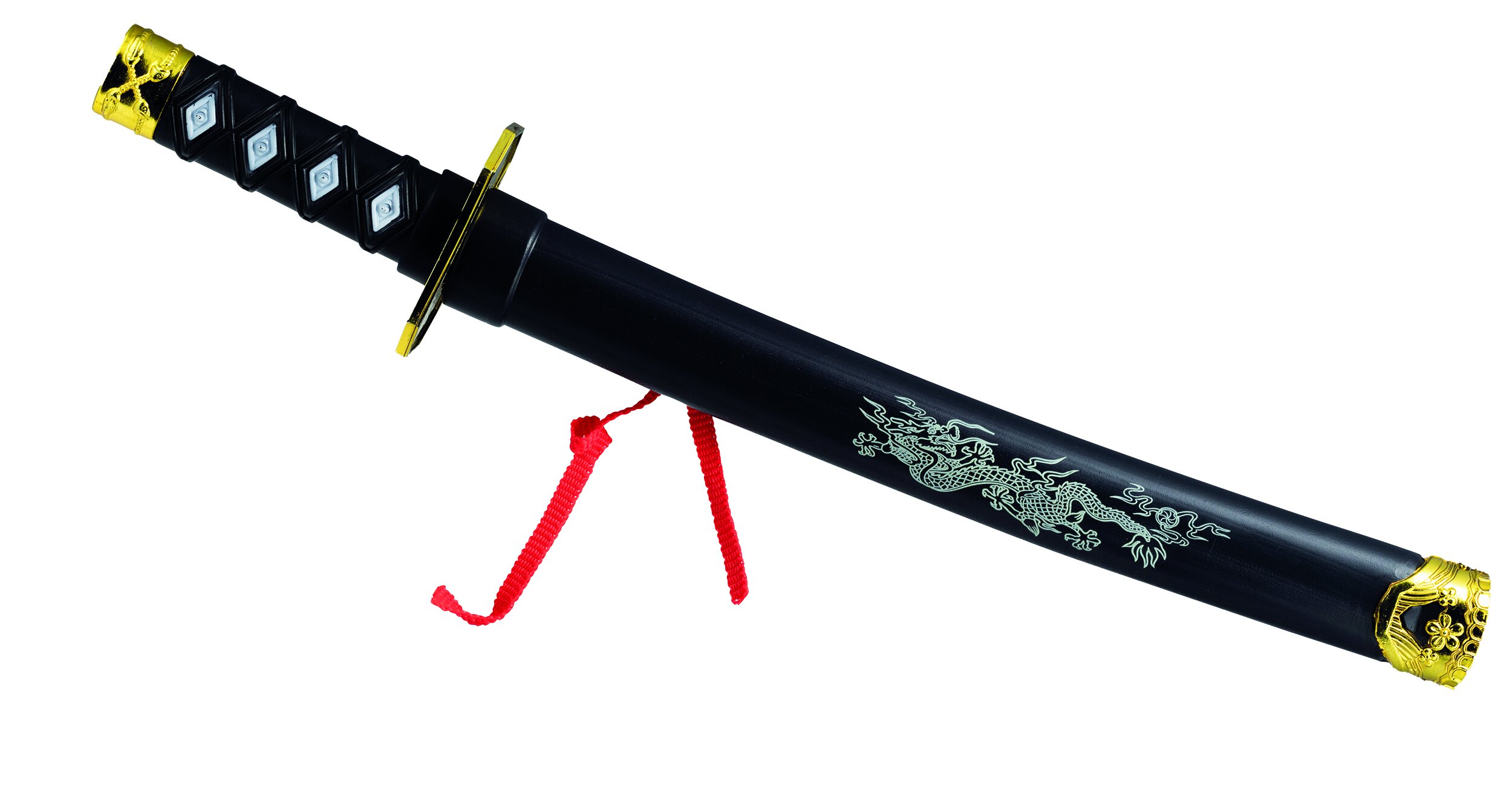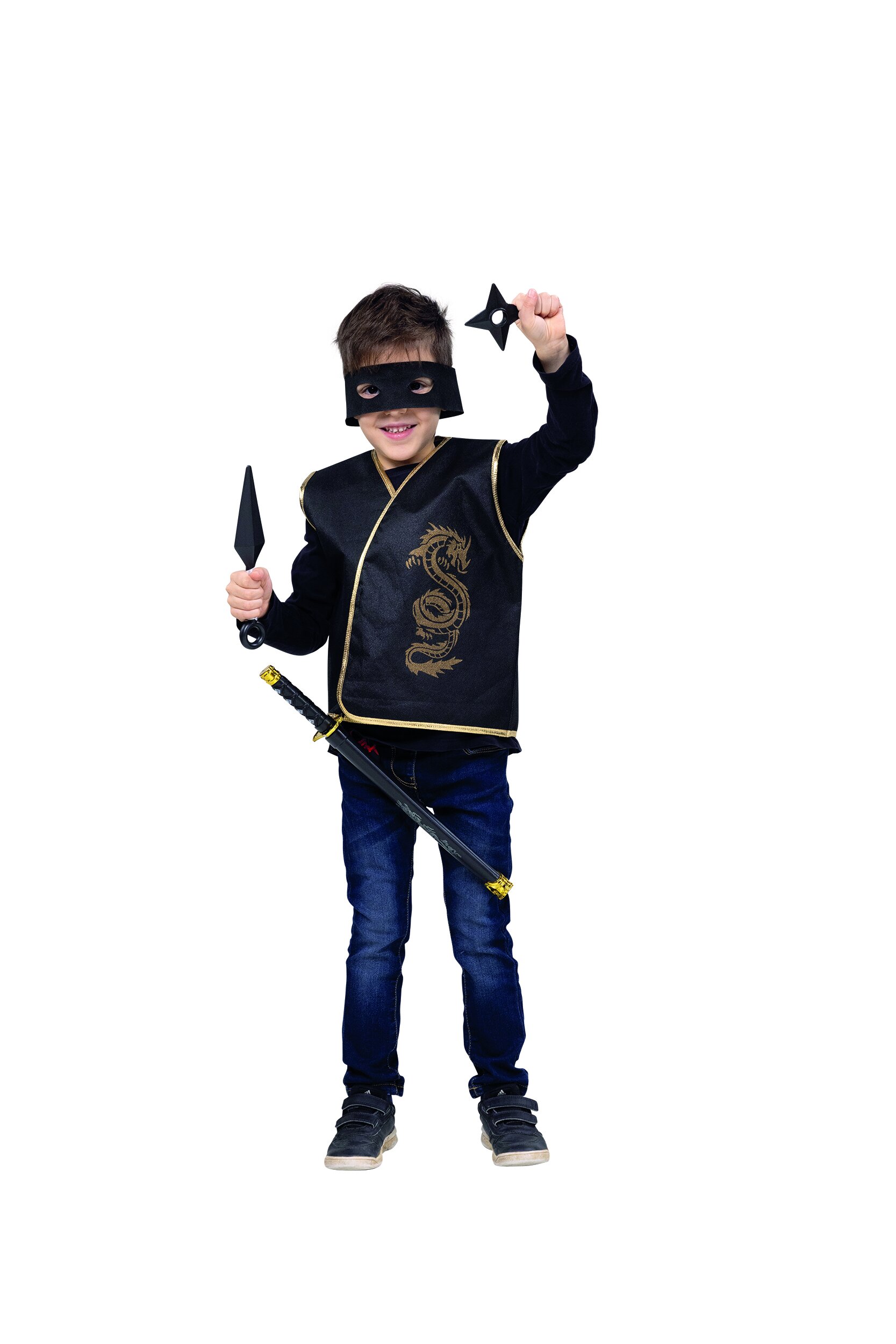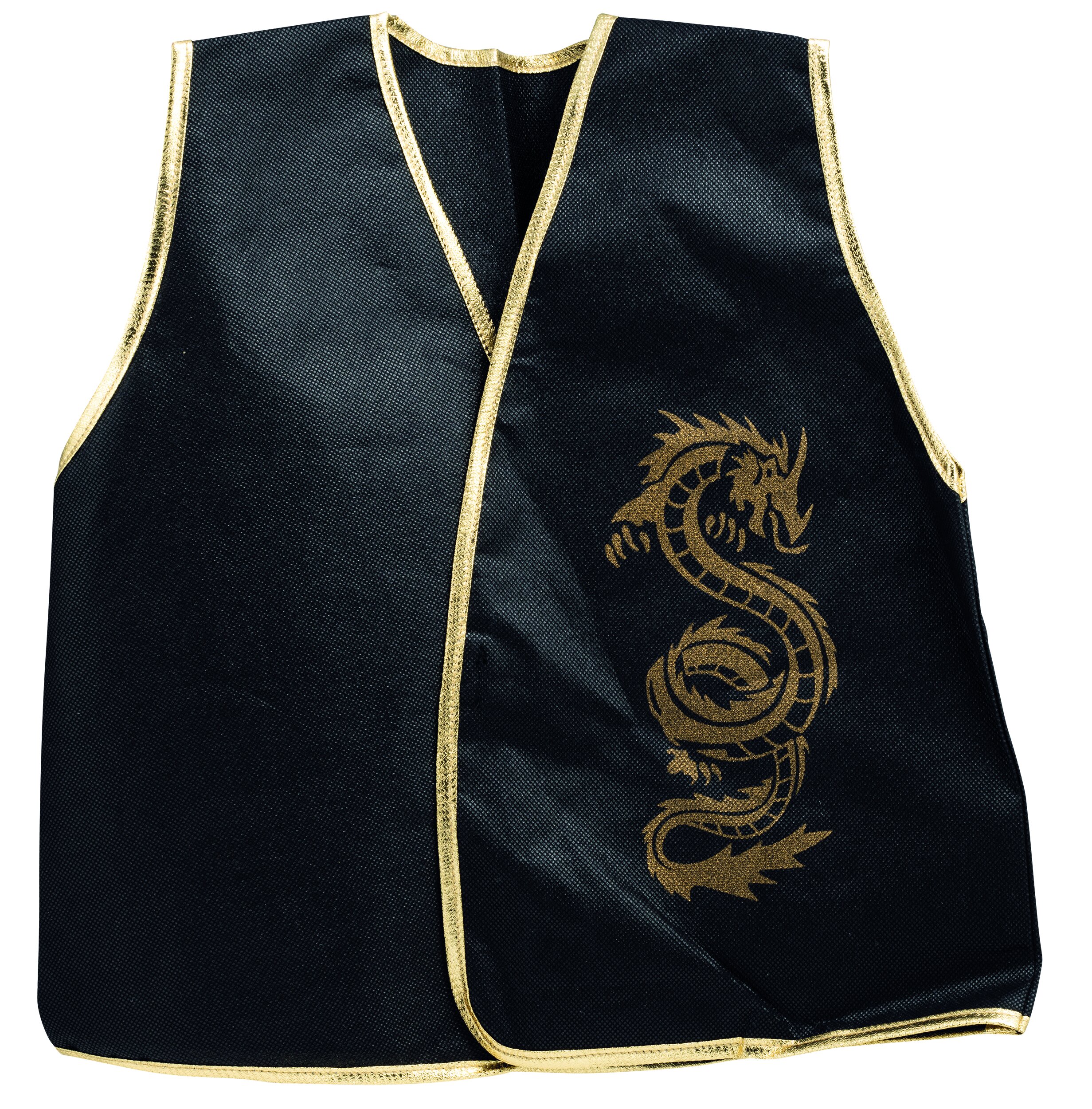 A black ninja vest with golden details and a dragon motif. Also includes a sword, dagger, headband and three throwing stars.