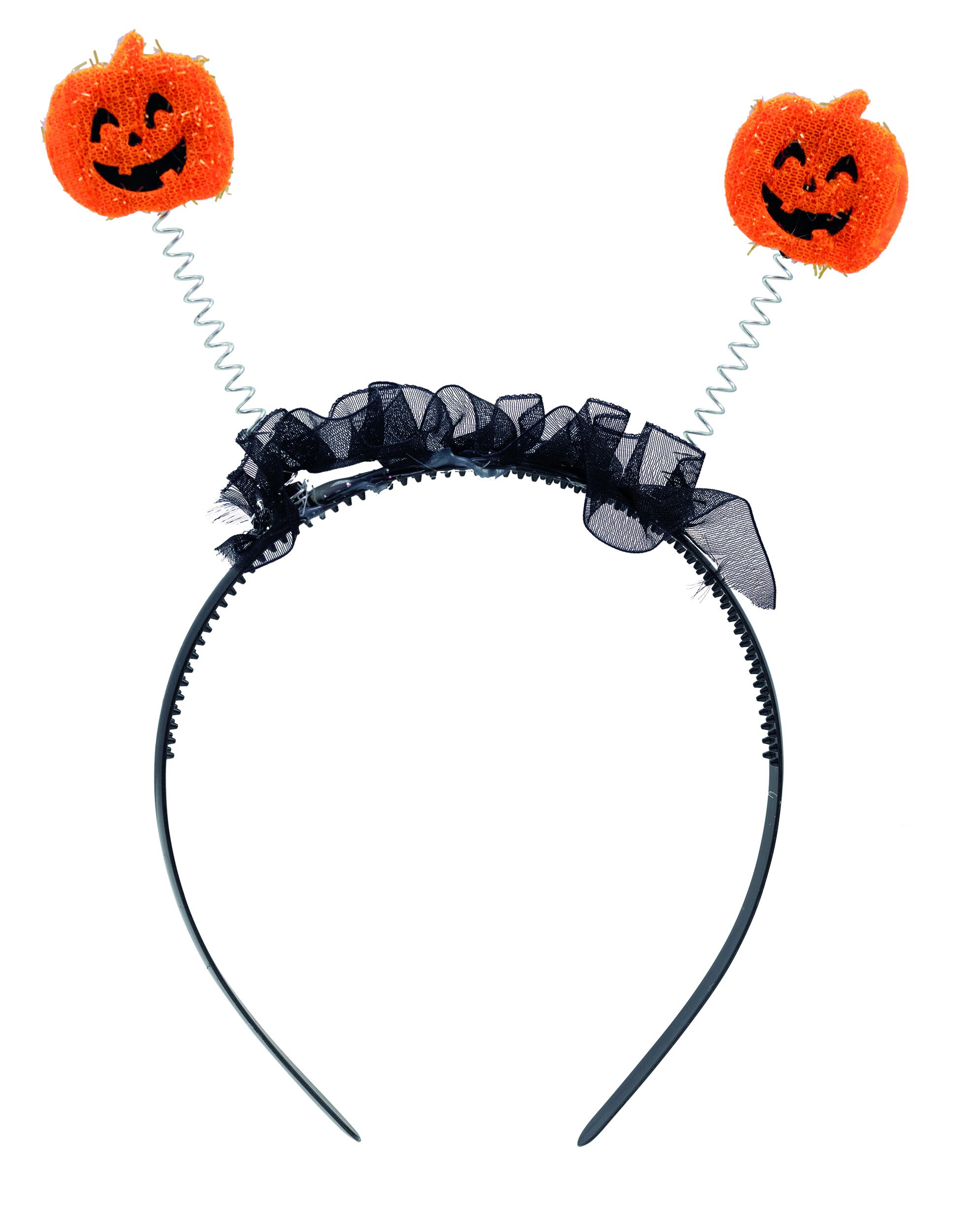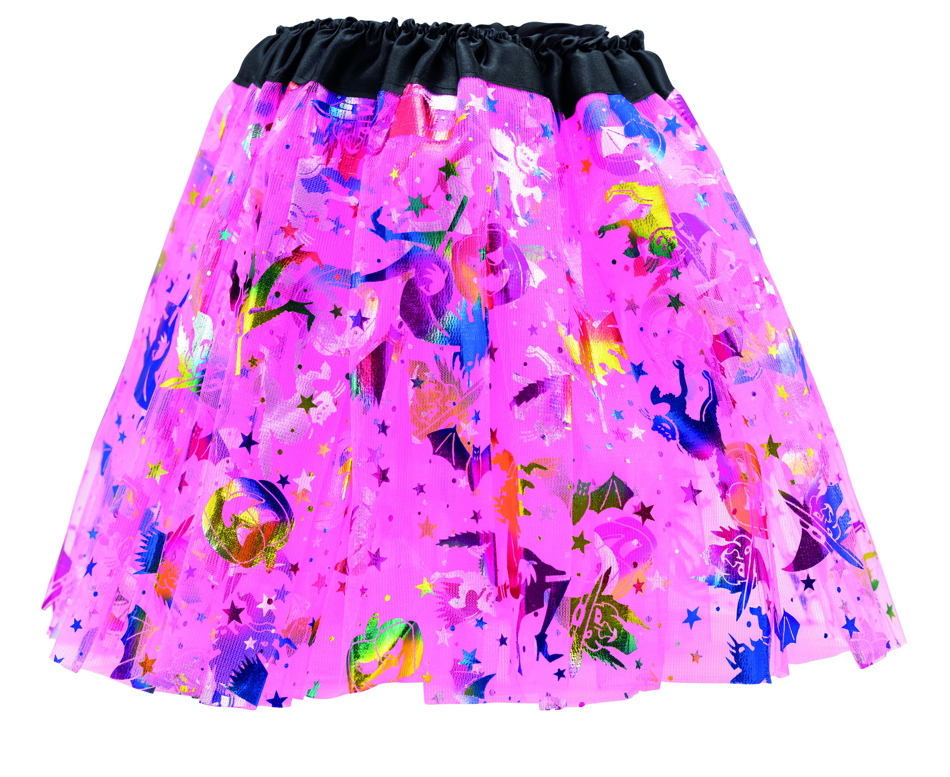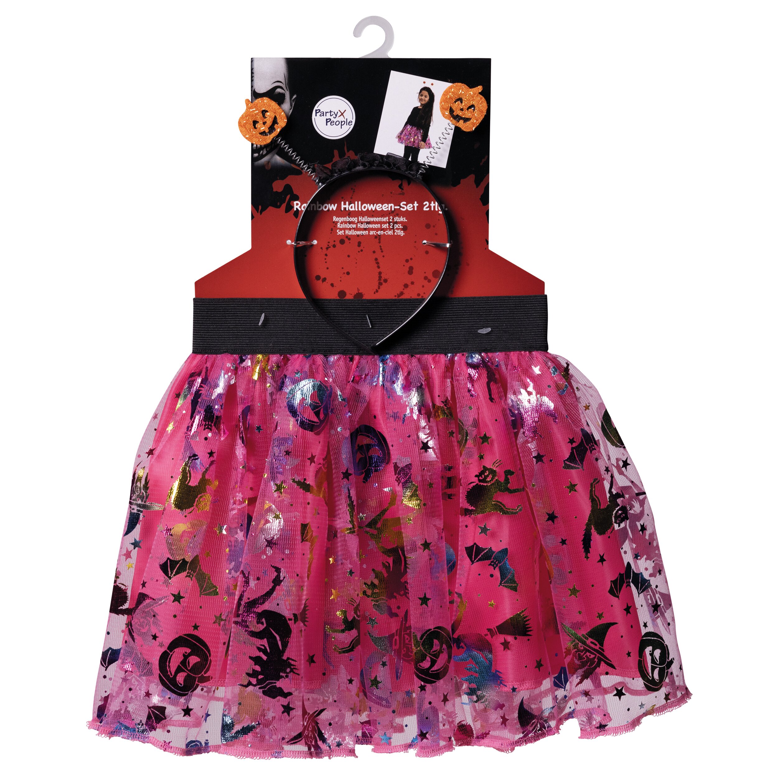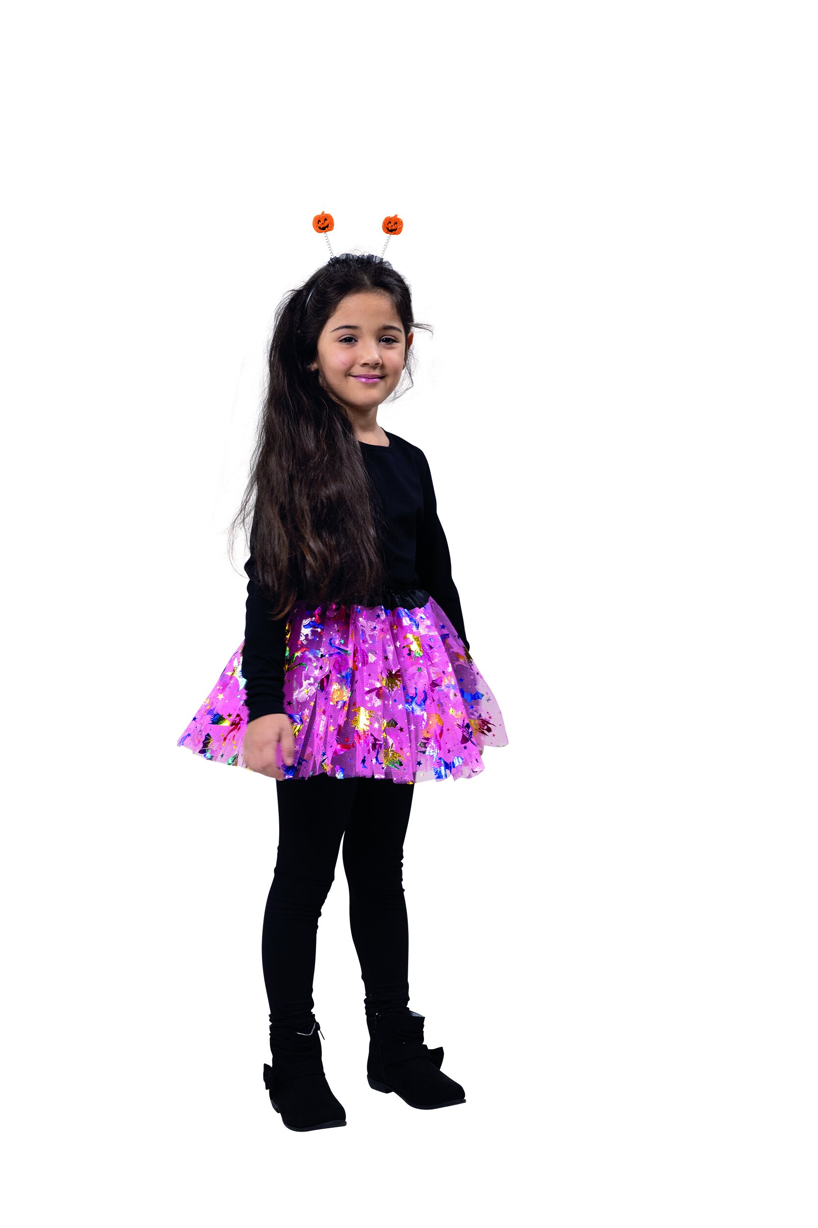 Both tulle layers are pink, the top layer is also decorated with colorful Halloween motifs in a metallic print. The elastic waistband is sewn into black satin fabric. The headband is decorated with two laughing pumpkins on metal feathers and ruffled black tulle.
